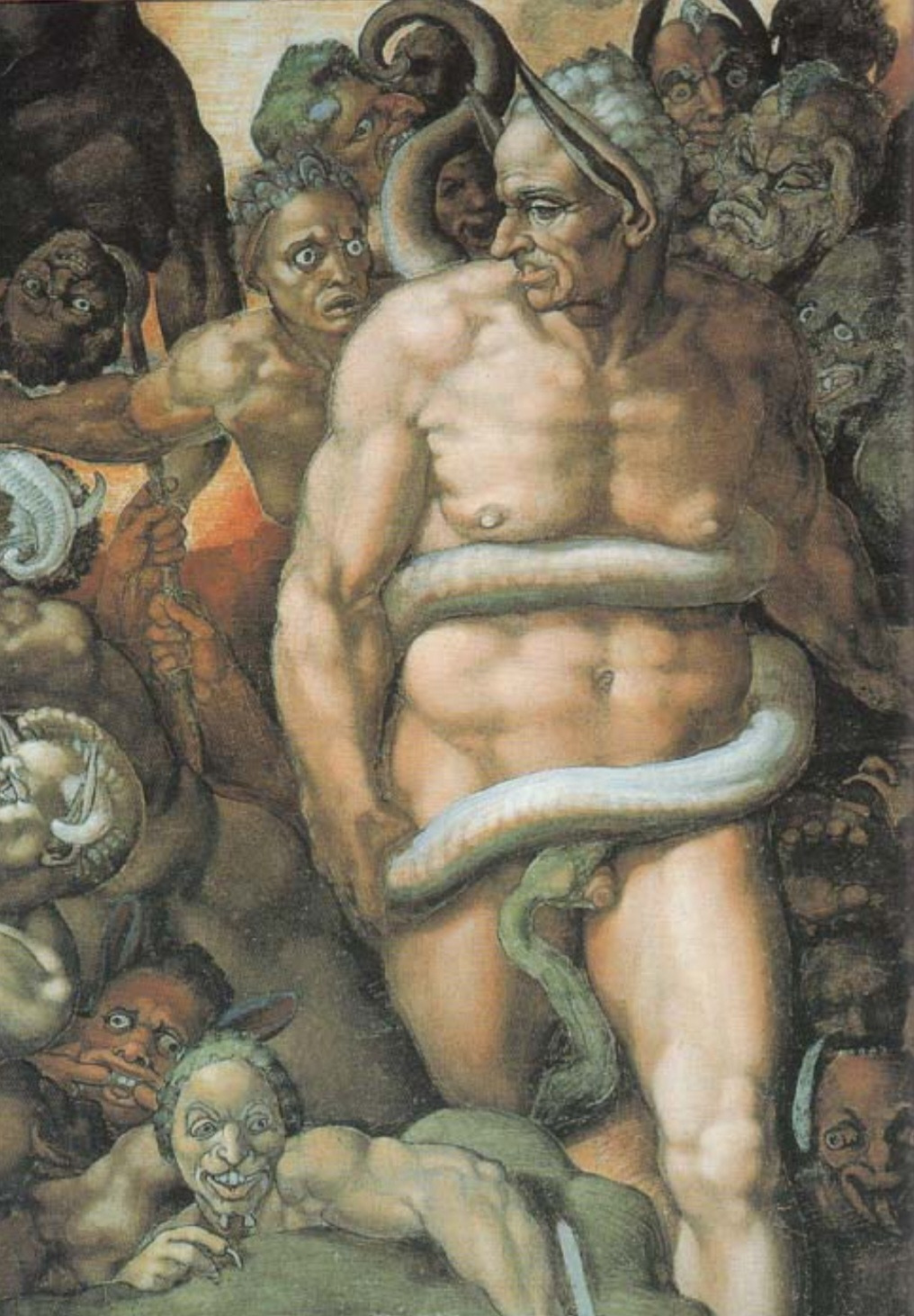 그곳을 확대한 그림이 오늘의 포인트이다. 이 <최후의 심판> 그림은 위쪽이 천당, 중간이 인간세계와 연옥, 아래쪽이 지옥을 나타낸다. 제일 우측 아래의 당나귀 귀를 가지고 온몸이 뱀에게 휘감긴 사나이가 무리들을 노려보고 있다. 더욱 끔찍한 것은 뱀이 날카로운 이빨로 그의 성기를 덥석 물고 있는 것이다. 그는 바로 지옥에서 심판을 담당하는 미노스(Minos)이다. 당나귀 귀에 대한 설화는 다양하다. 그리스 신화에서는 탐욕스러운 황금의 왕인 미다스(Midas) 왕이 당나귀 귀를 가졌다. 우리나라는 신라 48대 경문왕(景文王)이 당나귀만큼 큰 귀를 가졌다. 서양은 이발사가, 우리는 모자 장인이 임금의 귀에 대한 비밀을 밝히게 된다. 임금이 당나귀 귀를 가졌다면 민심을 잘 들으라는 뜻이 되지만, 여기서 당나귀 귀는 어리석음을 나타낸다. 화가가 단단히 화가 난 모양이다. 마음에 안 드는 사람을 이렇게 영원히 그림에서 지옥에 떨어뜨렸으니까.