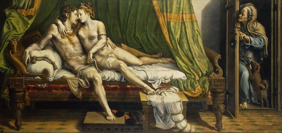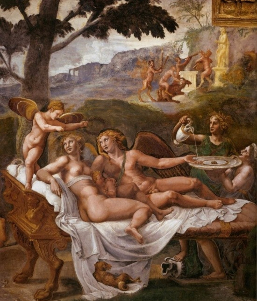 위는 쥘리오 로마노(Giulio Romano : 본명 Giulio Pippi))의 <Two Lovers>이다. 그는 르네상스 3대 거장 중 하나인 라파엘로(Raffaello)의 수제자였다. 작품 이름은 시대에 따라서 다양하게 불렸으나 편의상 <연인들>로 한다. 벌거벗은 두 연인이 휘장이 둘러진 침대에서 사랑을 나누느라 여염이 없다. 사랑을 갈구하는 여인의 왼손은 어느새 자기도 모르게 사내의 사타구니를 더듬어 소중한 무언가를 찾아서 살짝 잡아보고 있다. 벗어 놓은 옷가지가 발아래서 차인다. 침대는 화려하게 조각된 목재의 고급스러움이 드러나고, 특히 침대 양쪽 다리 윗 부분에 돋을새김(Bas-Reliefs)으로 염소 모습을 한 숲의 신과 여인이 성관계를 하는 모습이 새겨져 있다. 침대 밑에는 고양이 한 마리가 귀를 쫑긋 거리고 있는데, 이 고양이는 이 화가의 다른 그림 <마돈나와 아이와 고양이>에 나오는 것과 같다. 이 그림에서 가장 주목받는 것은 문 뒤에서 몰래 쳐다보는 늙은 하녀와 개 한 마리이다. 훔쳐보는 것일까, 지켜주는 것일까, 경고하는 것일까? 쥘리오 로마노의 이 작품이 당시 너무나 음란하여서 공개를 못하고 암암리에 소장가의 손으로 흘러 다닌 모양이다. 그러다가 1700년대 중반 러시아의 여제(女帝) 예카테리나 2세가 미술품 수집가 라이펜슈타인(Johann Friedrich Reiffenstein, 1719-1793)을 통해 런던의 토마스 젠킨스(Thomas Jenkins)로부터 이 작품을 구매하여 에르미타주(Hermitage) 박물관에 보관되게 된 것이다.