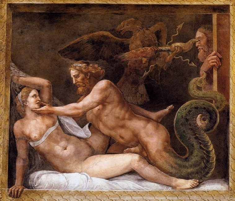 그래서 당초 에르미타주 박물관의 카탈로그는 이 작품을 <용감한 장면(Gallant Scene)>으로, 1850대 중반 카탈로그에서는 <마르스와 비너스(Mars & Venus)>로, 1958년도의 카탈로그에는 <알렉산더와 록산느>로 표시되어 있었다. 반면에 작가 네버로프(Neverov)는 <제우스와 알크메네>로, 하트(Hart)는 <불성실한 아내에게 남편의 귀환을 경고하는 하녀>로, 손튼(Thornton)은 <고객을 받는 창녀> 등으로 명명된 것을 보면 사랑을 나누는 두 사람 사이가 정상적인 관계가 아닐 것 같다. 따라서 신화의 내용대로 제우스가 알크메네(Alcmene)의 미모에 반하여, 전쟁에 참여한 그녀의 남편 암피트리온(Amphitryon)의 모습으로 변해서 그녀의 침실로 들어가서 불륜을 저지르는 상황이 제일 무난할 것 같다. 그들이 저지른 사랑의 결과로 헤라클레스가 탄생하게 되는 것이다. 위는 그의 다른 작품이다 프레스코화로 <제우스와 올림피아>이다. 예쁘고 가녀린 미녀를 막 덮치려고 하는 제우스의 모습이 험상궂으면서 근엄하다. 손은 포근하게 여인의 턱을 쓰다듬고 있지만 아랫도리는 잔뜩 성을 낸 모양으로 곧장 그녀의 가랑이 사이로 돌진할 태세이다. 여기도 둘만이 아니라 제3의 구경꾼 필리포스(Philipos)가 존재한다. 남의 은밀한 광경을 몰래 훔쳐보다가 눈을 다칠 수도 있겠다. 제우스의 분신인 독수리가 그의 눈을 노리고 있다.