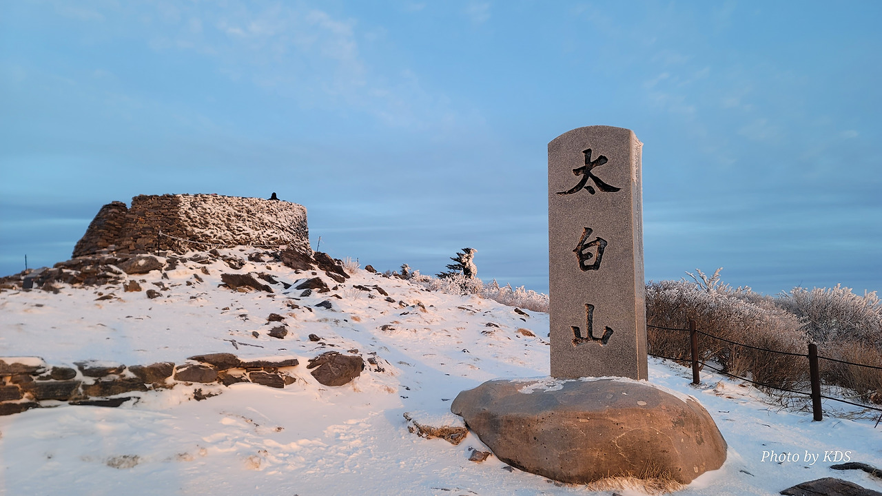 태백산 봉우리에 올라 일출을 바라보며