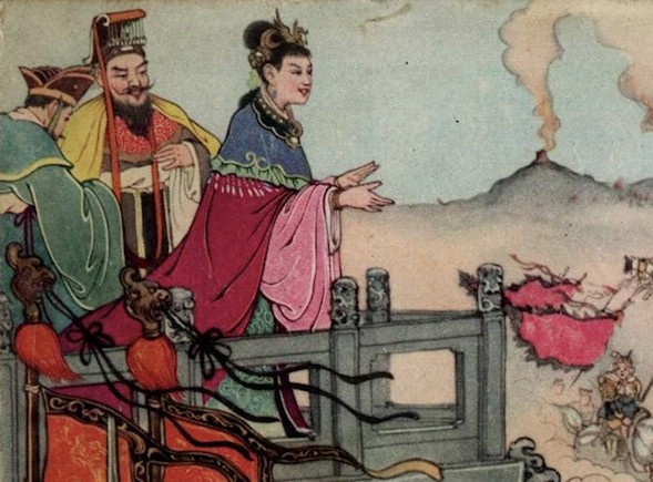 당장에 비단 수백 필이 동원되고 비단 찢는 여자들이 집결해서 찢어댄다. 포사는 어이없어 하면서 뺨 근처에 경련 같은 약간의 실소(失笑)를 아주 가늘게 지었을 뿐이었다. 그나마도 유왕은 미친 듯이 즐거워했다. 그래서 매일 산더미 같이 비단을 쌓아놓고, 찢어 제키니 국고(國庫)의 비단들은 벌써 바닥이 났고, 제후(諸侯)들과 심지어 일반 백성들로부터도 비단을 징발(徵發)해서 나라에 비단이 남아날 턱이 없었다. 그러자 백성들의 원성은 하늘을 찌를 듯이 높아만 갔다. 그래도 포사는 입 꼬리만 약간 움직일 뿐 크게 기뻐하지는 않았다. 유왕은 급기야 대국민 긴급포고령을 발표한다. 누구든 포사를 웃게 하는 자에게 천금의 상을 내리겠다. 이때 천하의 간신 괵석보(虢石父)가 왕에게 알랑 방귀를 뀌어 댄다. “봉화대(烽火臺)에 불을 피우면 각 제후들이 군사들을 몰고 긴급 출동해 올 겁니다. 제후들이 땀을 뻘뻘 흘리면서 집결하면, 별일은 없고 그냥 심심하던 차에 봉화(烽火)를 시험 삼아 올려봤으니까 각자 돌아가라고 명령을 내리십시오. 그 모습을 보면 왕후께서 반드시 웃으실 겁니다.” 유왕은 그 계책이 그럴듯해 그대로 시행한다.