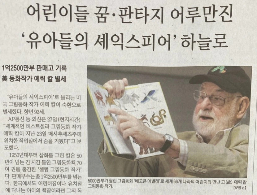우리 집에서 아이들과 마르고 닳도록 읽었던 영어 동화책의 작가 에릭 칼의 별세 소식을 담은 기사였다.