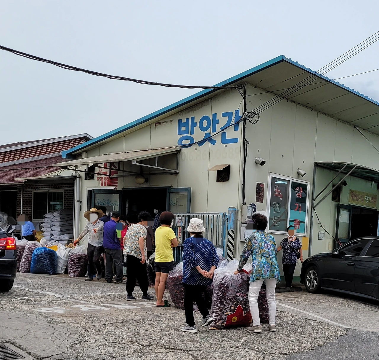 고추 가루를 빻으려는 어르신들이 커다란 고추 포대를 들고 방앗간 앞마당에 줄을 서 계신다.