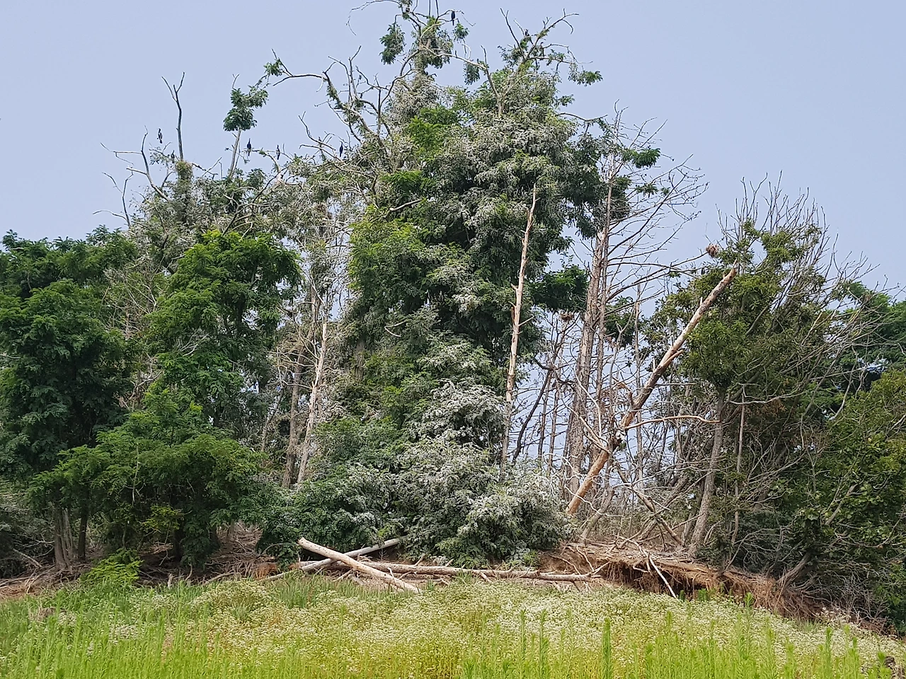 죽은 나무들과 하얗게 뒤덮인 배설물,먹이를 사냥해 둥지로 돌아오는 가마우지,