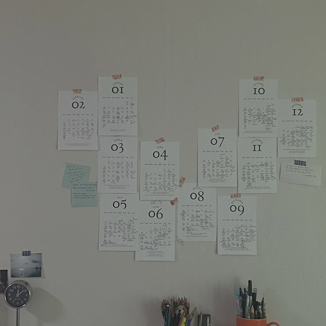 정확히 일년 전 오늘, 거실 한쪽 벽에 2021년의 달력을 붙였습니다. 1월부터 12월까지 365일의 날짜들. 백지 상태의 텅 빈 달력을 보며 앞으로 이 수많은 날들을 어떻게 채워나갈지 기대에 부풀었더랬죠. 전 구체적인 일정들은 구글캘린더에 시간대별로 기록하지만, 이 종이 달력에는 굵직하고 중요한 일들만 표기했어요. 그래서 이 달력의 특정 날짜에 무언가를 쓰는 일은 수많은 할일과 약속 중에서 내게 '정말' 의미있는 것은 무엇인지를 거르는 작업이기도 했습니다. 정신없이 바쁜 와중에도 달력을 올려다보며 한번씩 삶의 우선순위를 되새겨봤던 것 같아요. 그렇게 한해의 발자취가 달력의 빈칸들을 채웠네요. 1월 1일부터 12월 31일까지의 역사를 훑어봅니다. 설레고 긴장하고 힘겨웠고 안도했던 제가 다시 돌아오네요.