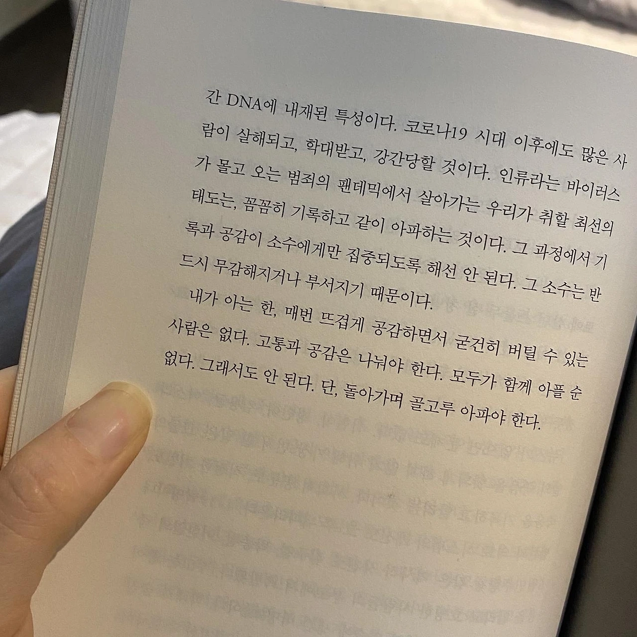 이런 극심한 통증은 오랜만이라 그동안 내 몸과 평화롭게 공존해왔던 시절이 아득하게 느껴졌다. 코로나는 전파력과 감염력이 강한 바이러스이고 치명율이 낮은 변이들이 계속해서 대유행을 만들고 있다는 점에서, 음성과 양성을 건강한 자와 건강하지 않은 자로 단순하게 가르기기는 애매하다. 이젠 코로나를 계절독감처럼 관리하려는 논의도 시작됐으니까. 이 질병이 앞으로 우리와 어떤 관계를 맺게 될 지는 더 지켜봐야겠지만 적어도 이번 감염은 내게 건강을 다시 생각하게 했다. 건강에 대해서는 자신있던 나도 질병과 사고에 관해서는 똑같이 취약한 한 사람뿐이라는 사실을 말이다. 친절한 징후 따윈 없어 예측할 수 없고 순식간에 발현해 손 쓸 수도 없는 병들. 게다가 그것의 증상들은 즉각적으로 몸을 망가트리고 마음까지 무너지게 만든다는 것을. 어찌보면 건강은 영구한 평화가 아니라 일시적 휴전 상태인지도 모르겠다. 우리의 긴 생애주기 속에서 건강한 시기는 반짝하는 기적같은 순간이고, 수많은 병균과 통증, 취약함과 불운에 맞서 이기고 지기를 반복하는 지난한 과정이 삶 그 자체라고. 나는 이제 겸허히 인정해야겠다고 생각했다.
