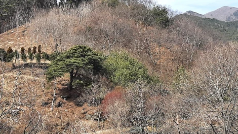 키 낮은 수풀 속으로 쉼 없이 드나드는 작은 새(참새, 박새)들의 날개 펼치는 소리가 파르르 파르르 들려오고 어미 소나무에는 조금 큰 새들, 까치와 산비둘기들이 가지에 걸리듯 앉곤 한다.