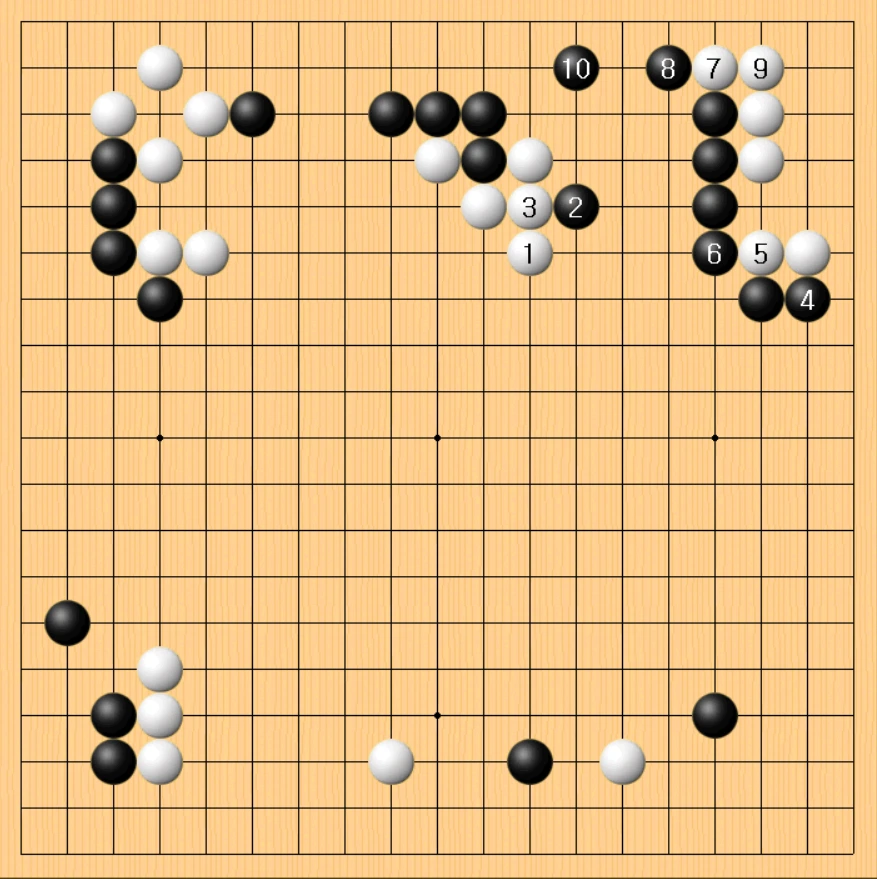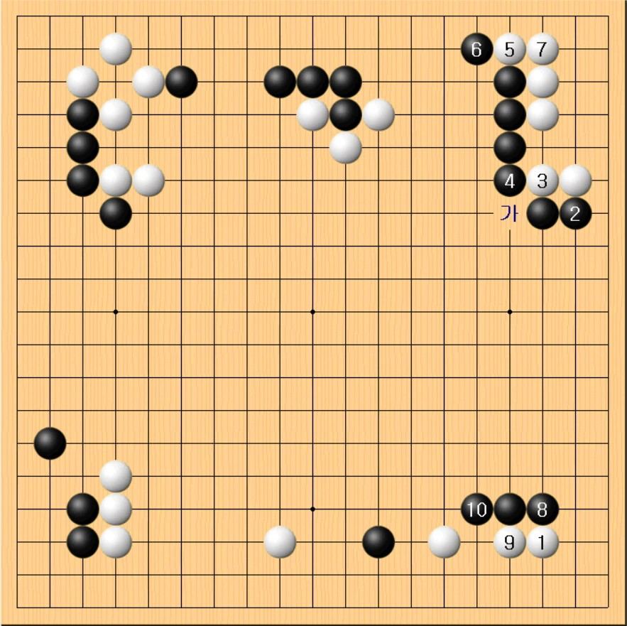 <참고도 2-2> 2로 먼저 막는 것을 선수하고 8,10으로 두면 모양이 비슷해 보이긴 한다. 하지만 이때는 상변의 연결이 확실치 않아 [가]의 약점이 치명적이다. 이 경우는 오히려 백이 약간 유리하다.