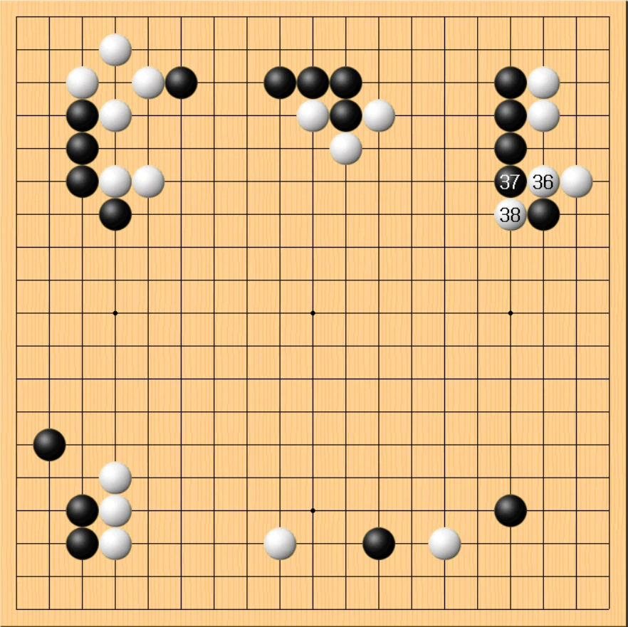 신민준은 시간을 쓰지 않고 즉각 36,38로 끊고 나왔다. 애초에 싸우기로 작정했는데, 굳이 이리저리 잴 필요가 없다는 생각이다. 박정환도 눈을 번쩍 뜨고 수를 읽기 시작했다. 이 바둑 첫 번째 전투가 발발했다.