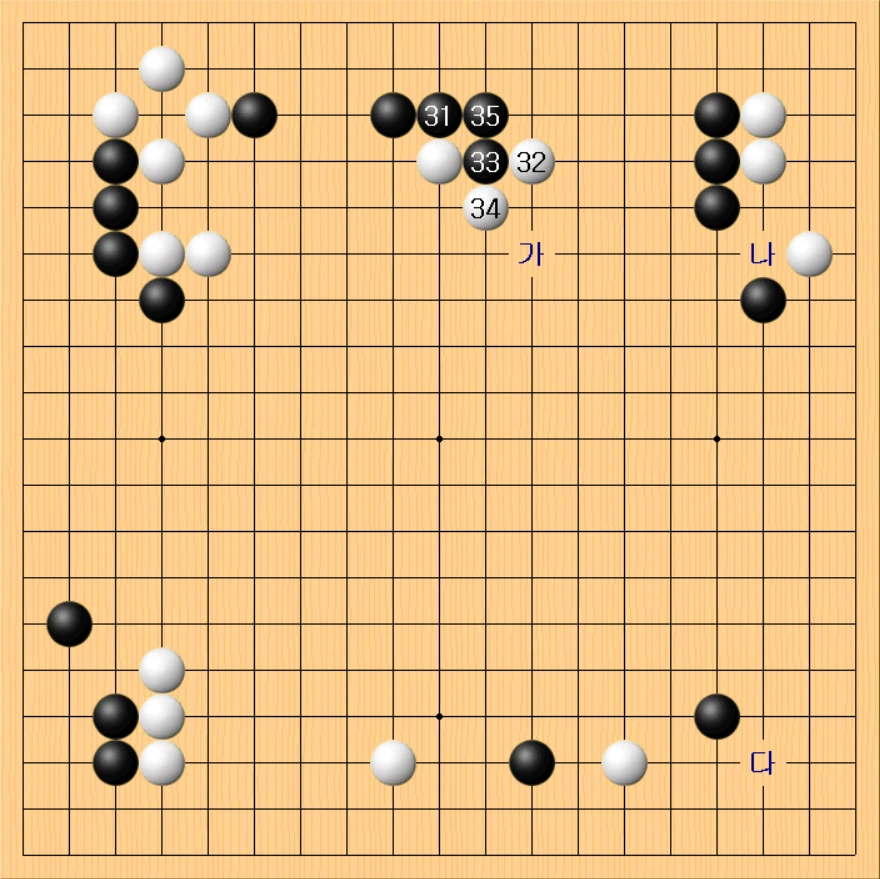 박정환은 어깨짚음에 잠시 고민하다가 31로 밀어갔다. 32로 한 칸과 33,35는 당연. 여기서 백은 기로에 섰다. <가>로 상변을 마무리할 것인가, <나>로 나와서 큰 싸움을 벌일 것인가. 아니면 <다>로 집을 챙기며 김빼기 작전을 펼 것인가.