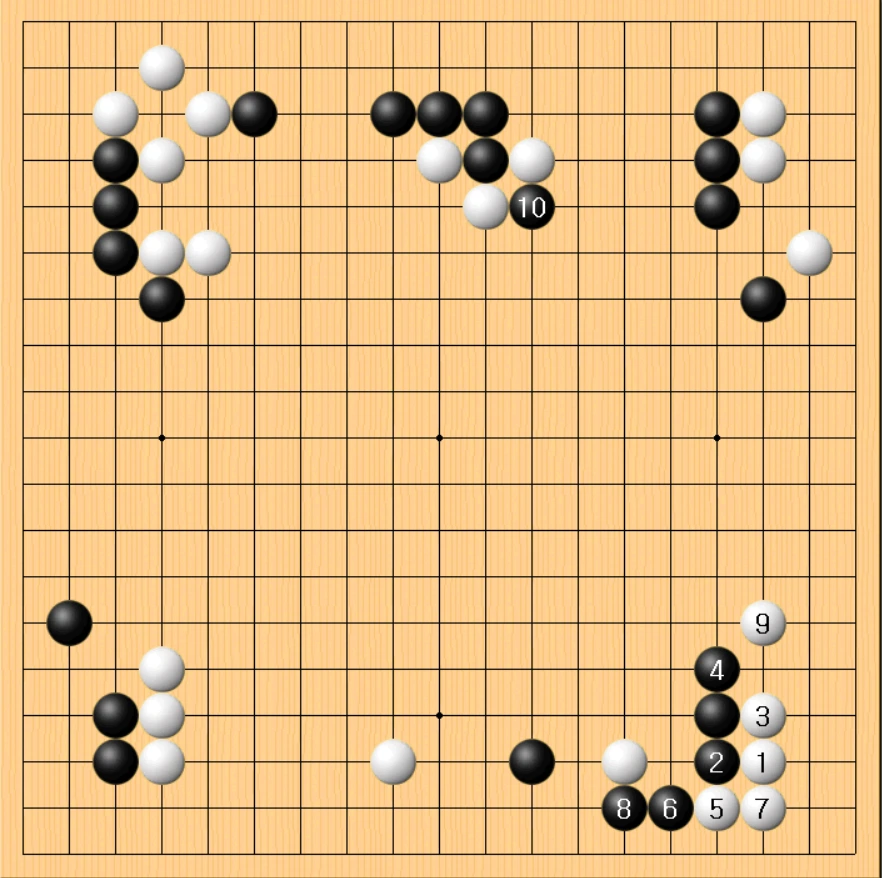 <참고도2> 1로 우하귀를 차지하는 것도 유력한 진행이다. 10으로 상변을 내주더라도 이미 백이 집을 많이 차지했기에 충분하다.(AI 추산 백 승률 50%) 다만 신민준은 전투를 원했기에 이렇게 정리하는 것은 성에 차지 않았을 것이다.