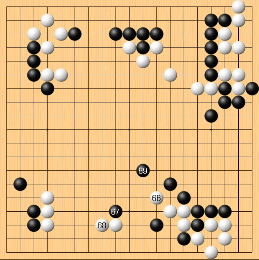 신민준이 66으로 나가자 박정환은 67을 교환해 둔 다음 69로 날아올랐다. 하변을 내주고 우변과 중앙을 차지하겠다는 큰 그림이다. 흑은 가볍게 손이 나오는 반면, 백은 고민할 거리가 많다. 흑을 잡은 박정환이 판을 잘 짜나가고 있다는 증거이다. 고심하던 신민준이 판의 운명을 결정지을 다음 수를 뽑아들었다. 과연 어디일까.