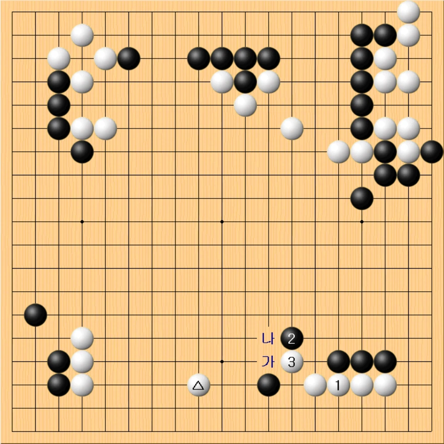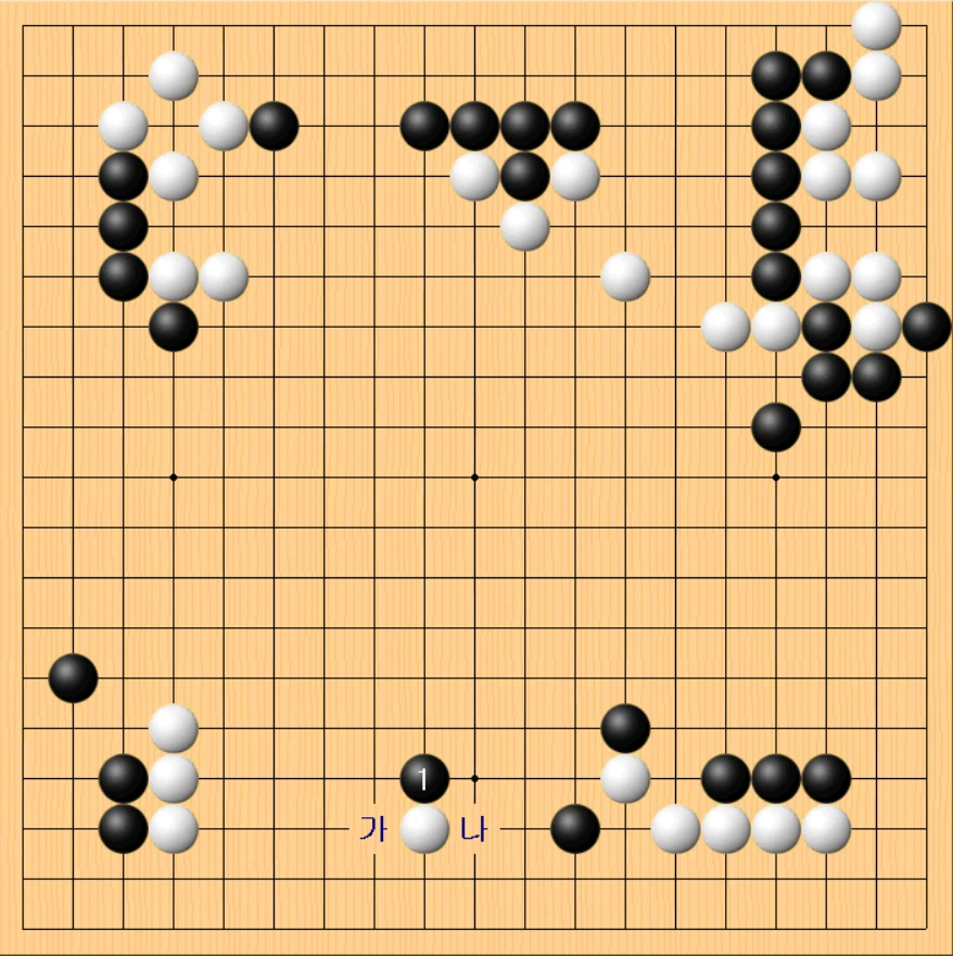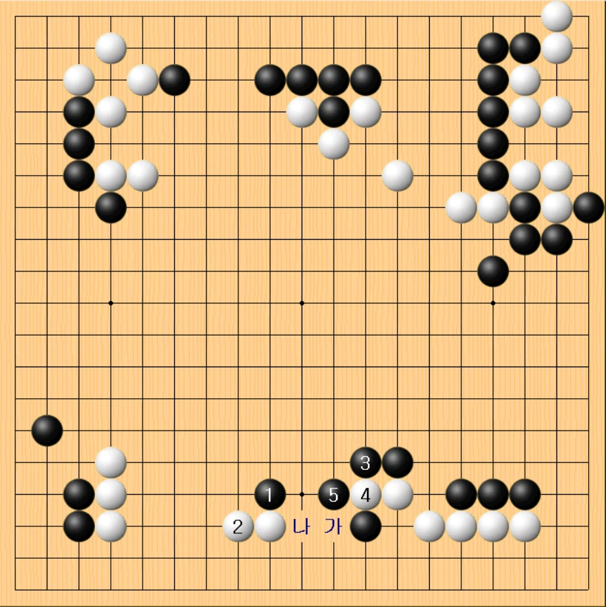 백이 2쪽으로 받는다면 3,5로 한 발 물러나 막는다. 1,2 교환 덕에 백이 [가]자리 끊을 때 [나]로 뚫어버릴 수 있다.