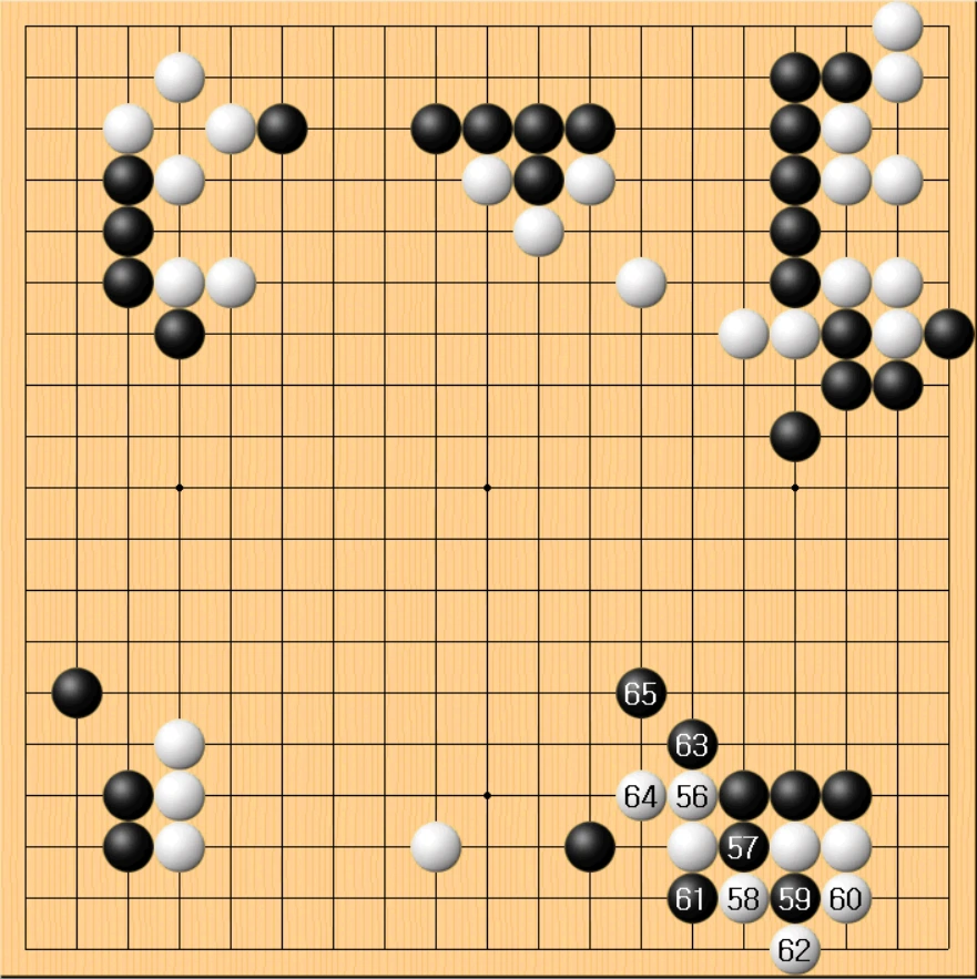 신민준은 56으로 밀고올라갔다. 57~65까지는 정석이다. 다만 지금 배석에서는 우변의 흑 모양이 넓기 때문에 흑이 유리한 변화이다.