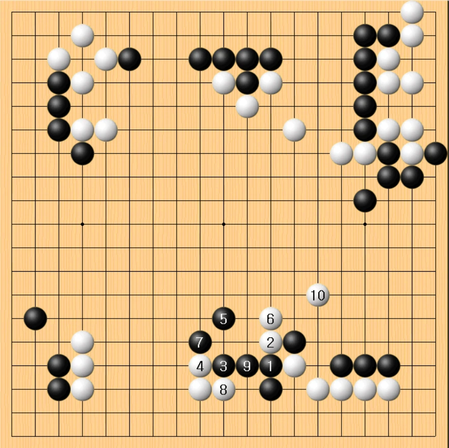 <참고도 1-4> 그냥 흑1,3으로 둔 경우와 비교해 보면 차이를 확연히 알 수 있다. 6으로 두었을 때 흑이 오히려 7로 받아야 한다. 그러면 10의 요처는 백이 선점할 수 있게 된다.