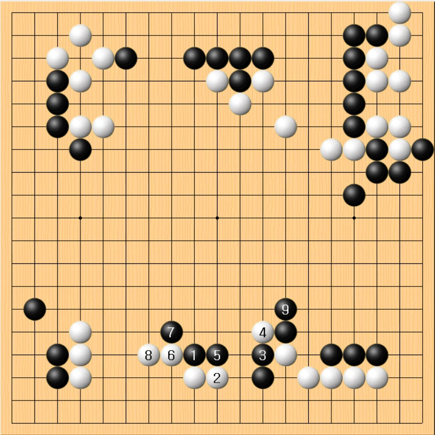 <참고도1-3> 2쪽으로 늘면 3,5로 누를 수 있다. 백이 하변을 받을 때 9로 늘게 되면 백이 끊어간 것은 헛발질이 된다.