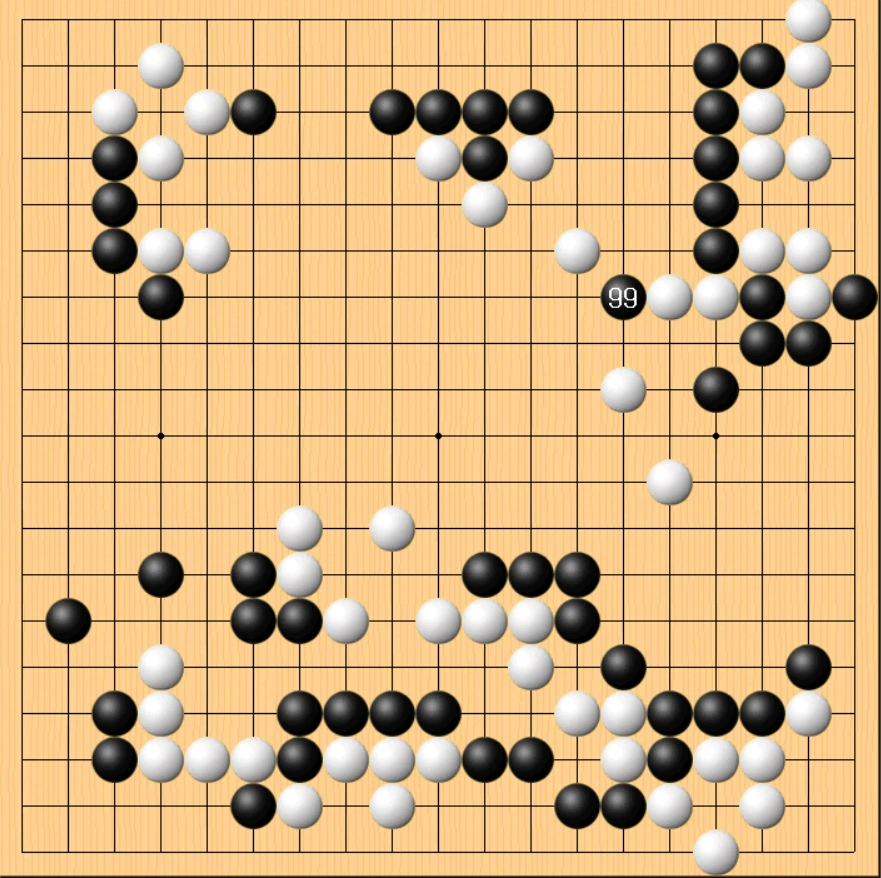 신민준은 99의 역습을 상상도 못 했던 것 같다. 99가 놓이자 깊게 숙이고 있던 허리를 펴 의자에 기댔다. 이 한 수에 백은 응수 두절이다. 어떻게 받더라도 백 모양은 망가지게 되어 있다. 신민준이 고통스럽게 다음 수를 찾는 동안, 박정환은 여유롭게 물병을 들어 목을 축인다.