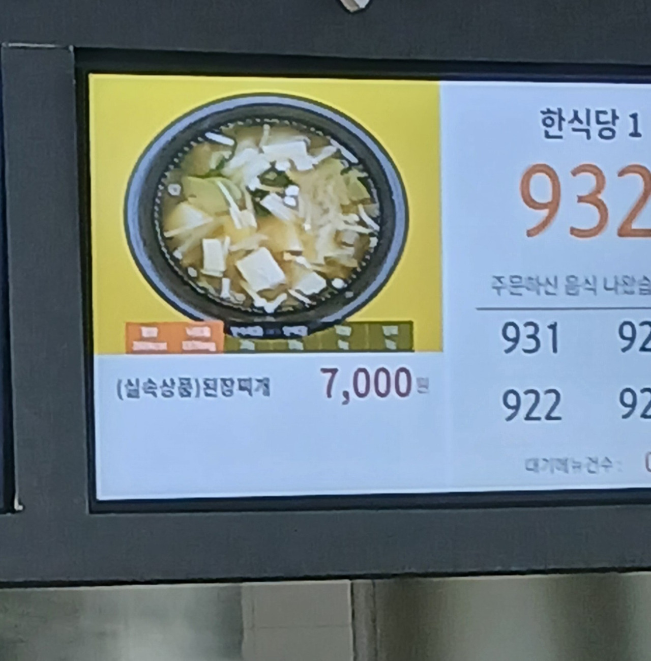 김밥을 먹은 지 2시간이 채 지나지 않았던 더라 나는 배에 뭔가를 넣을 수 있는 상태가 아니라고 판단하고 제일 싼 메뉴인 7천 원짜리 된장찌개를 골랐다. 휴게소 밥이라서 그런지 맛이나 양은 꽤 빈약했다. 역시 돈을 좀 더 들여서라도 돈가스 시킬 걸 그랬다.