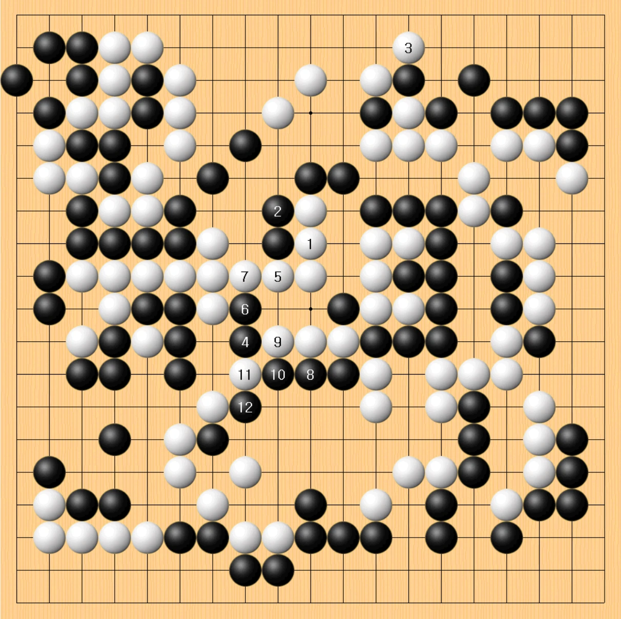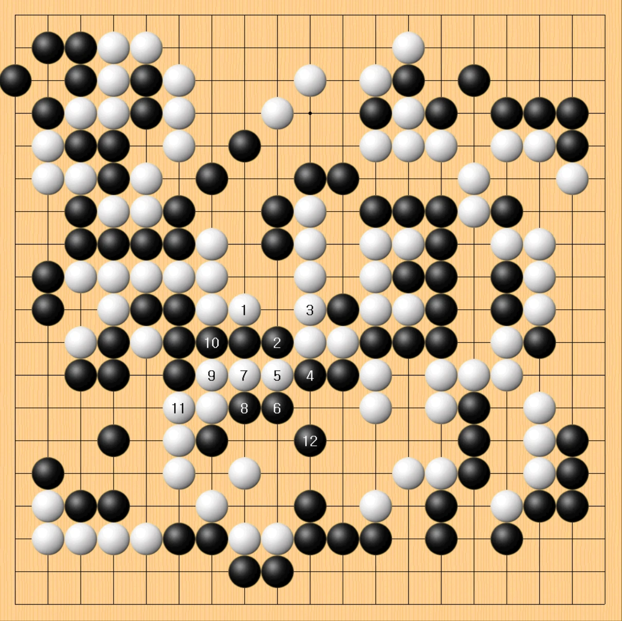 <실전진행2> 결국 백은 1~5까지 두 점을 잡는 데 그쳤고, 대마도 살고 흑6의 자리까지 차지해서는 역전이 이루어졌다. 이후 박정환의 마무리 실력이 빛을 발하며 흑의 승리로 바둑은 마무리되었다.