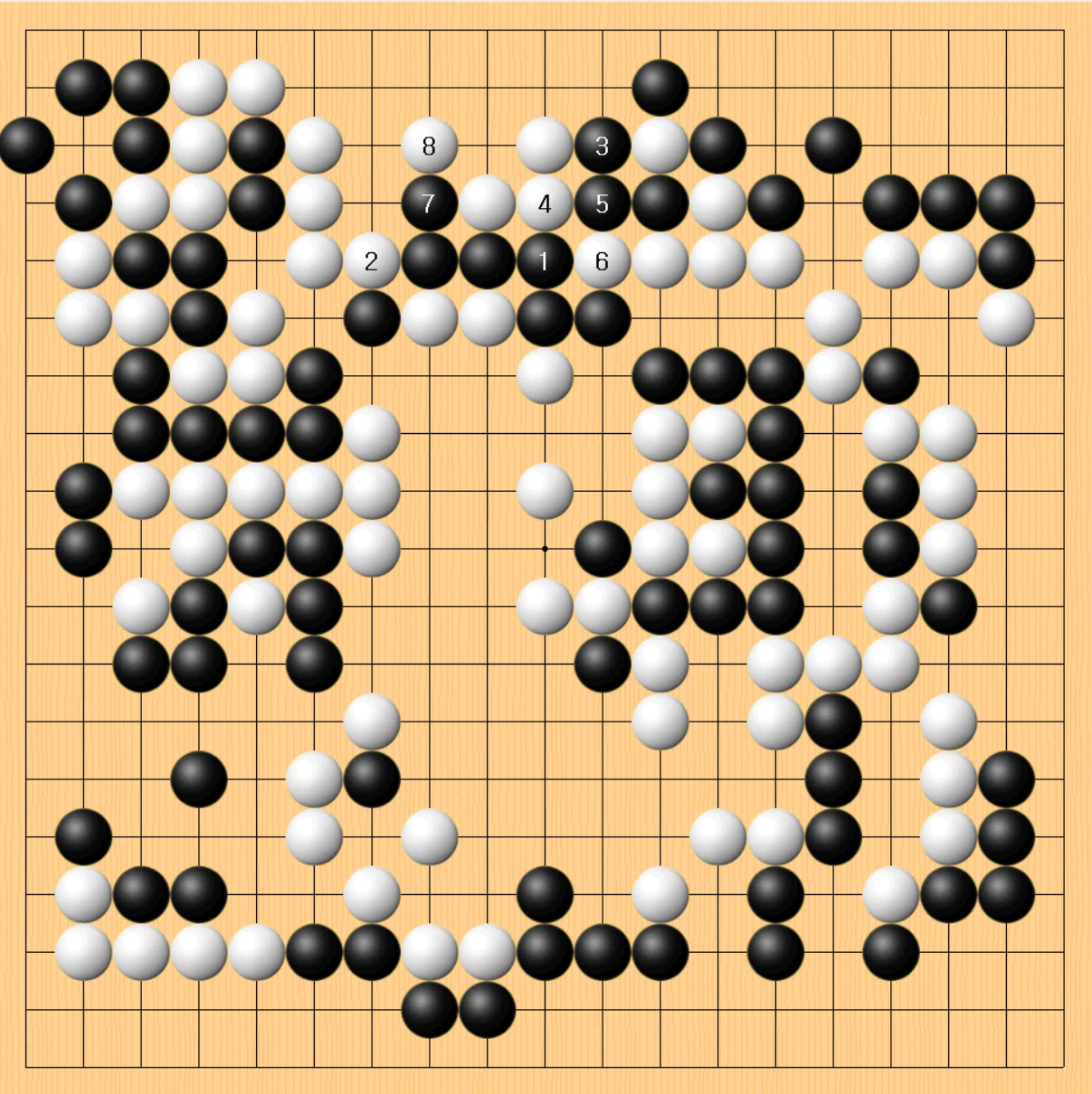<참고도1-2> 흑이 1쪽으로 이으면 백은 2로 끊는다. 3때 4가 좋은 수. 백8까지 진행되면 흑 대마는 더 발버둥 칠 곳이 없다.