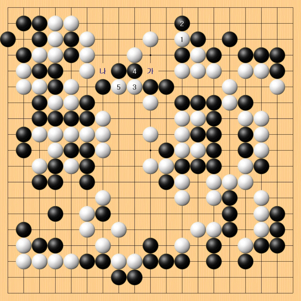<참고도3> 백이 이 상황을 타개할 방법은 의외의 곳에 있었다. 흑2로 두어왔을 때 백'가'와 흑'나'의 교환을 해두지 않고 그냥 백3자리에 단수치는 것. 이렇게 두었다면 백이 이길 수 있었다.