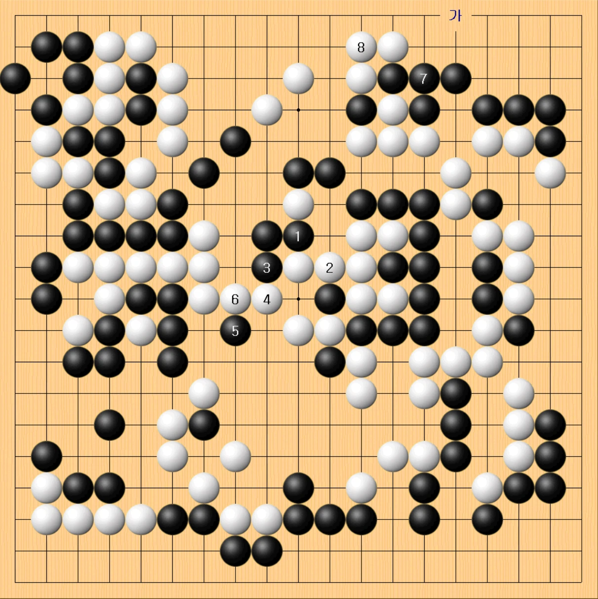 양카이원은 결정타를 준비해두고 있었다. 백1과 흑2를 교환해 두고 실전처럼 3,5로 두어가는 것. 이것으로 '가'와 '나'자리가 맞보기가 되어 흑 대마는 끊긴다.