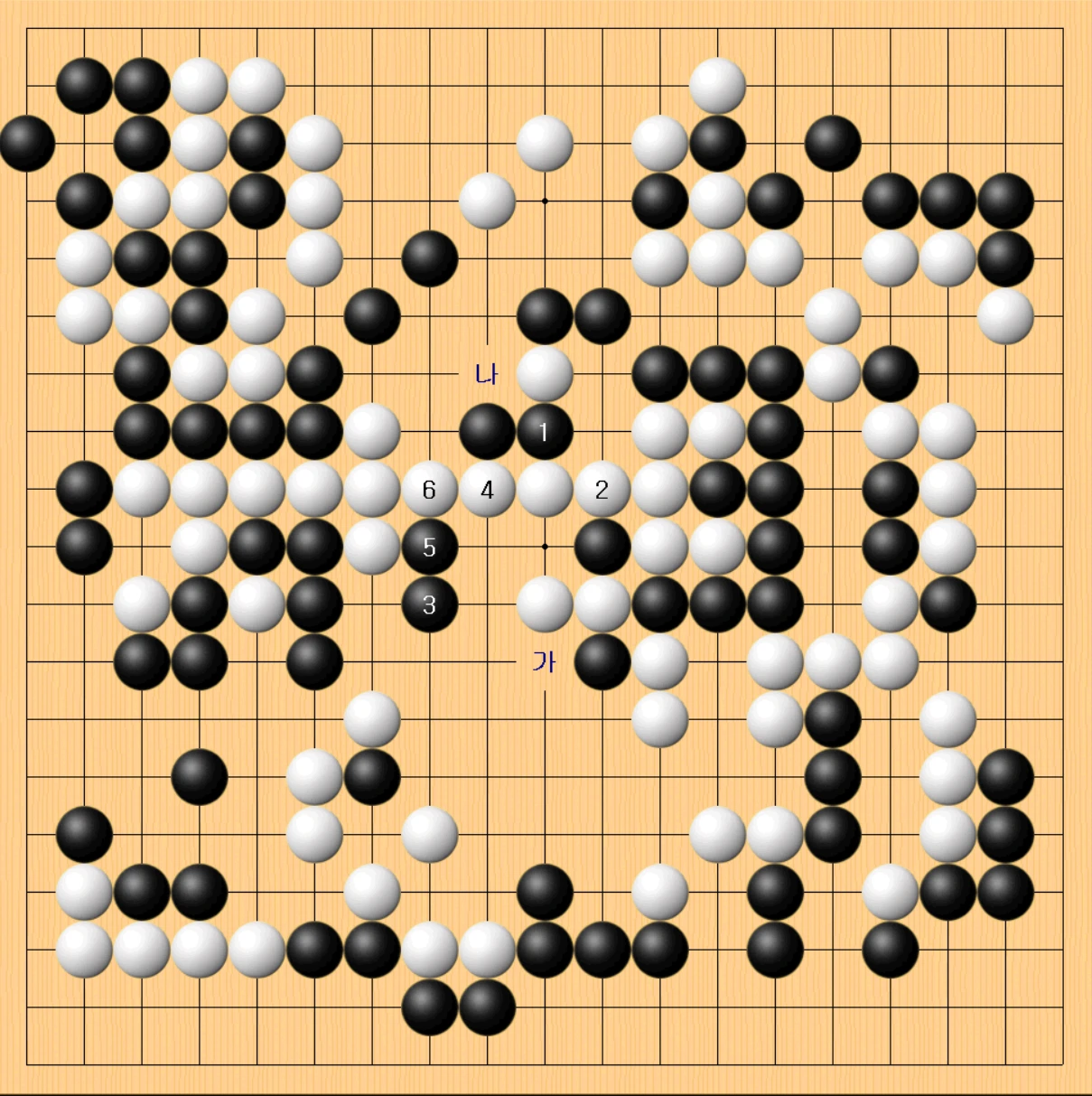 <참고도3-1> 흑이 똑같이 1,3으로 공격해 온다면 백은 4,6으로 받으면 된다. '가'자리와 '나'자리가 맞보기라서 흑은 더 공격할 수단이 없다.
