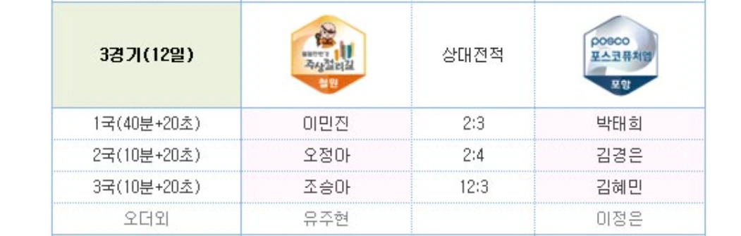 3경기는 6.5점(중)을 받은 철원과 5.5점(중)의 평가를 받은 포스코퓨처엠. 양팀 모두 압도적 1승 카드는 없지만 3명 모두 고른 전력을 갖고 있다는 점이 특징이다. 비슷한 성격의 두 팀. 누가 승리를 가져가게 될까?