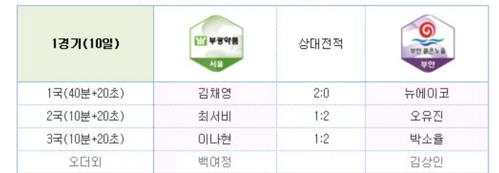 대망의 개막전은 서울 부광약품과 부안 붉은노을의 승부가 되었다. 앞서 나는 <팀 전력 분석> 편에서 부광약품 팀에게는 4.5점(중하), 부안 팀에게는 6점(중)의 평점을 준 바 있다. 하지만 이것은 다른 모든 팀들과의 대결을 염두에 둔 평점이다. 이 두 팀의 격돌은 어떻게 될까?