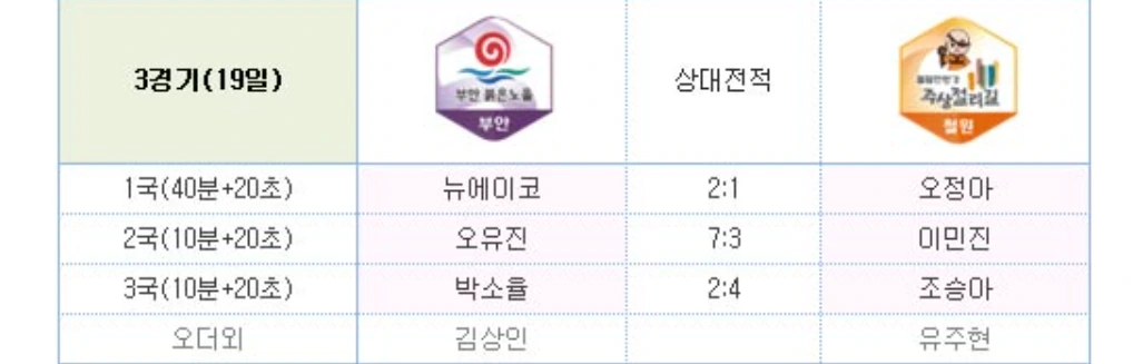 다음 경기는 충격의 패배를 당했던 두 팀의 대결이다. 부안은 믿고 보는 1승 카드였던 오유진이 패하는 바람에 부광약품에 1:2로 패했고, 철원은 객관적 우세에도 불구하고 포스코에 0:3 참패를 당했다. 충격에서 빠져나와 다시 위로 올라갈 발판에 발을 디딜 팀은 어디일까.