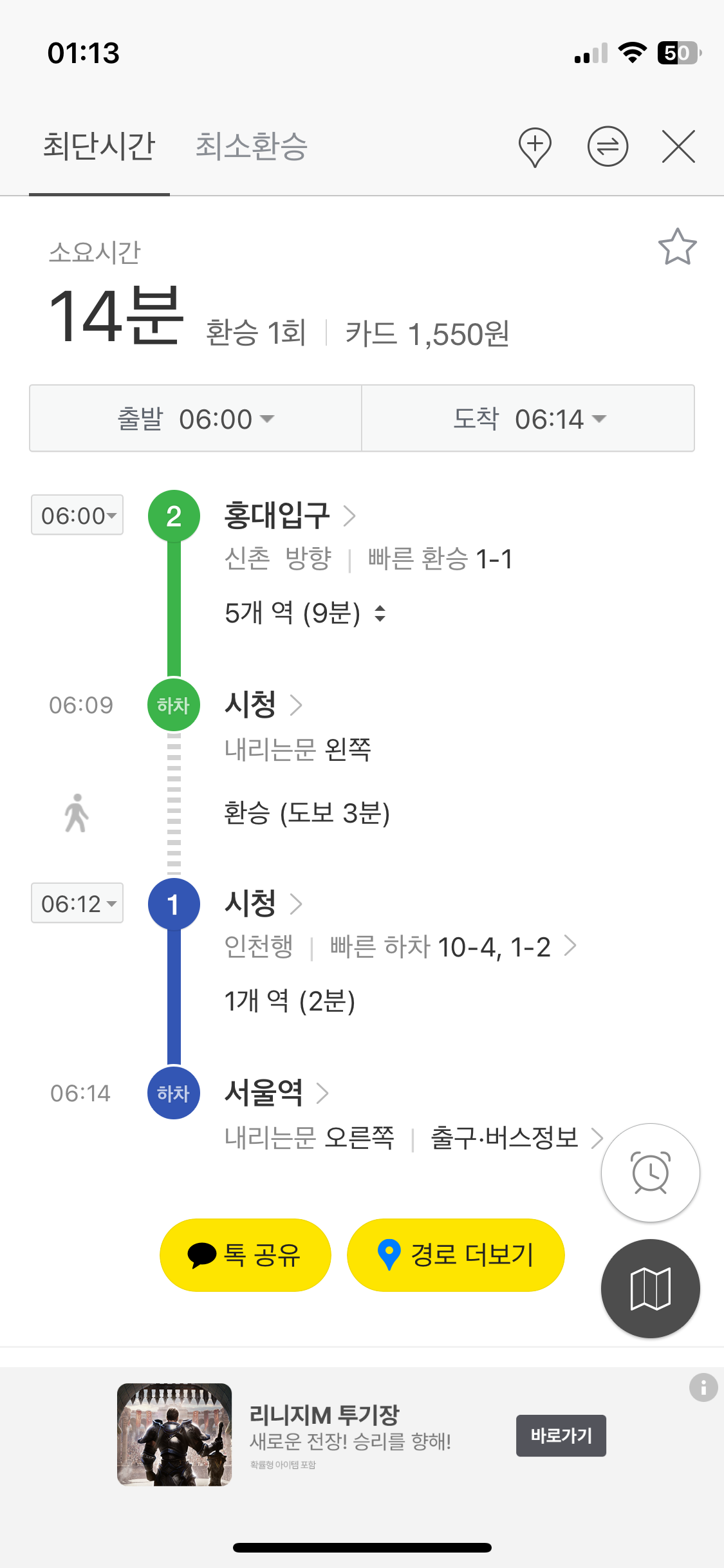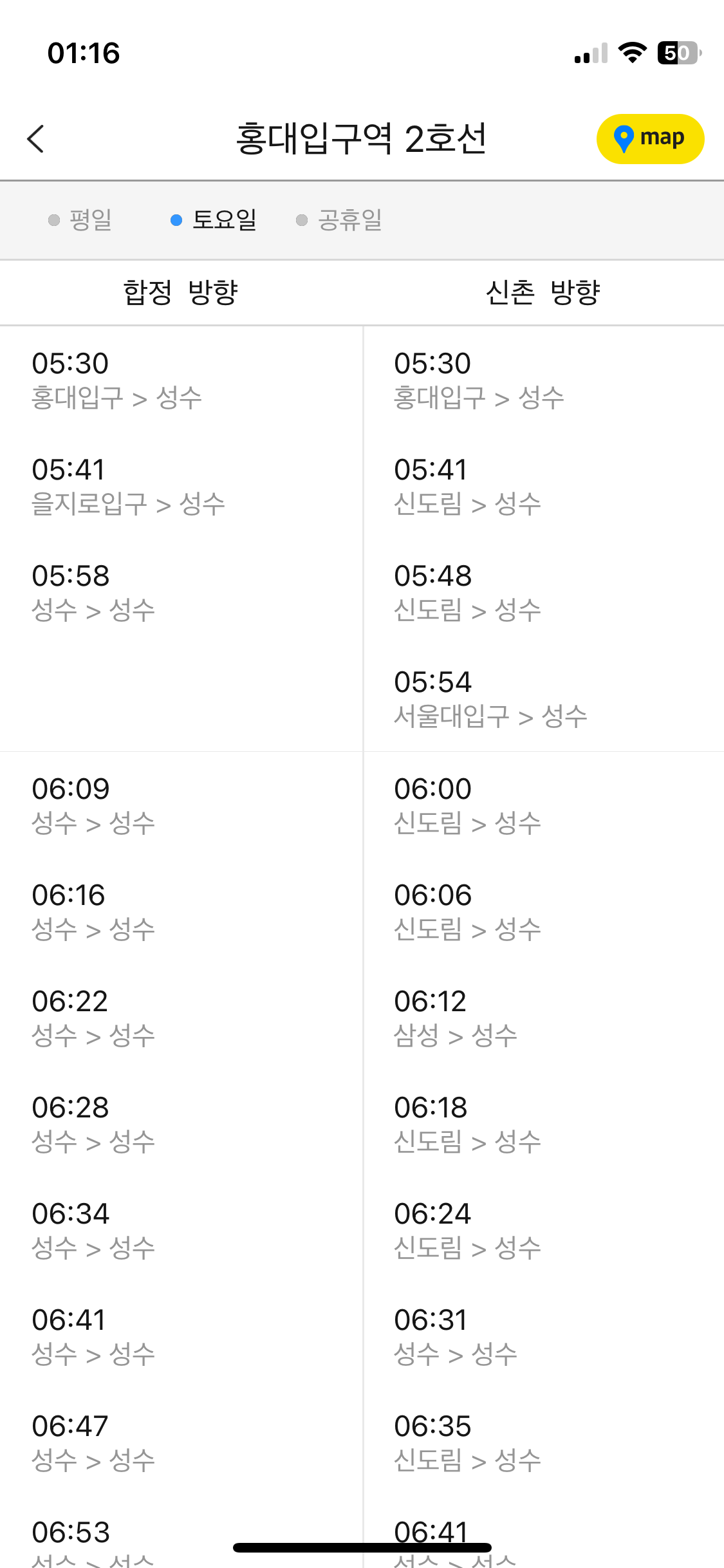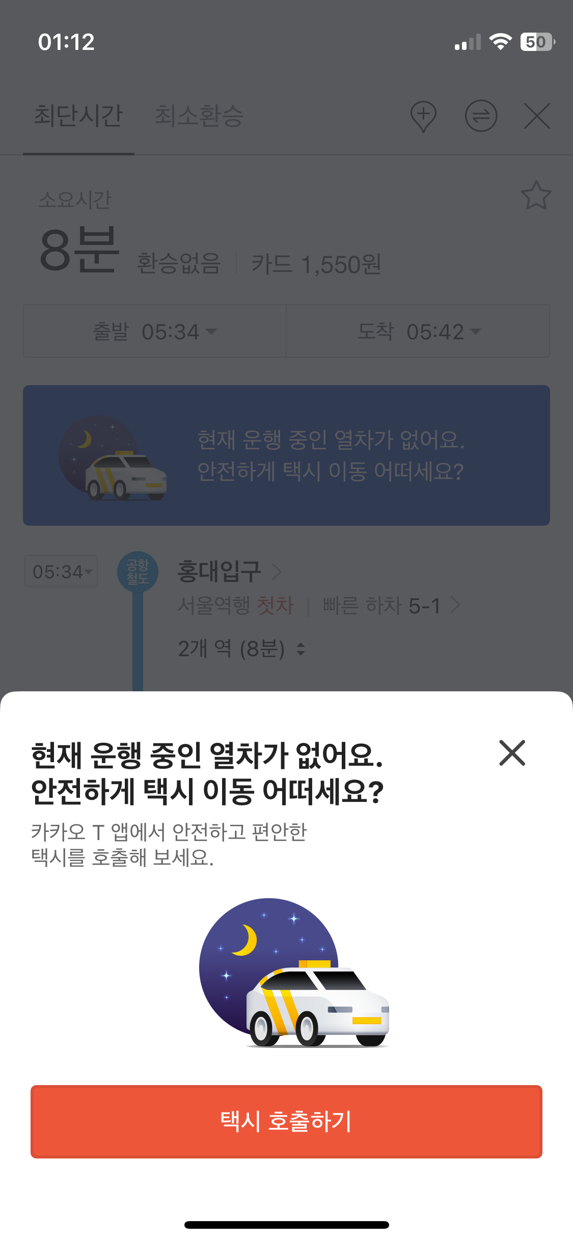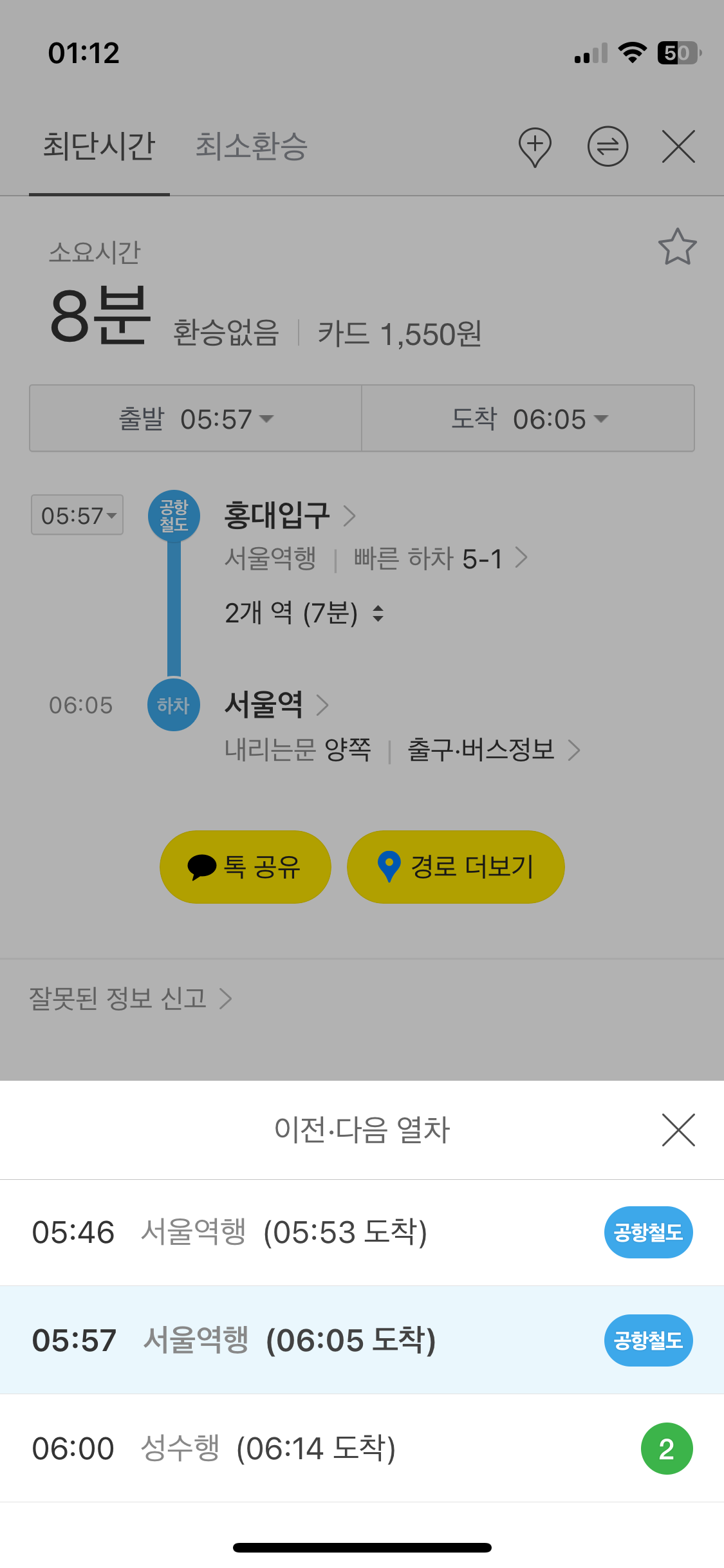 이전 다음 열차 보는 버튼이 한 번에 알아채기는 조금 시간이 걸렸습니다. 결국에는 05:57 저기 시간 버튼을 틀릭하면 하단에서 바텀시트가 올라옵니다. 딱 이전, 이후 앞뒤 2개만 알 수 있고 더 그 전이나 그 후로 가고 싶으면 일일히 눌러야 앞뒤가 보입니다. 살짝 불편합니다 사용성이.