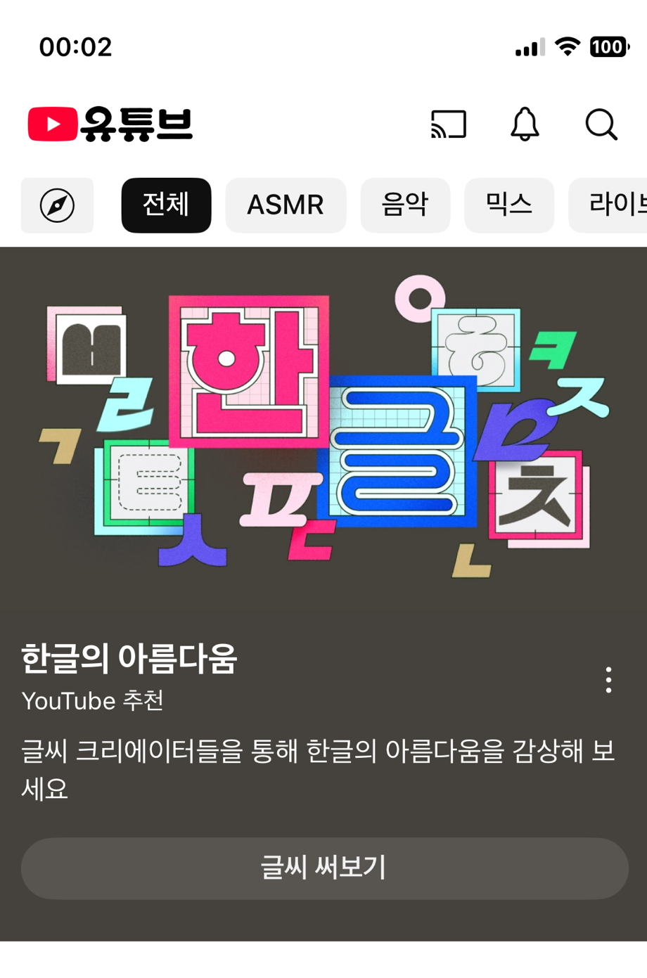 글씨 써보기를 클릭하면 ‘한글’ 태그의 영상들이 보이고요.