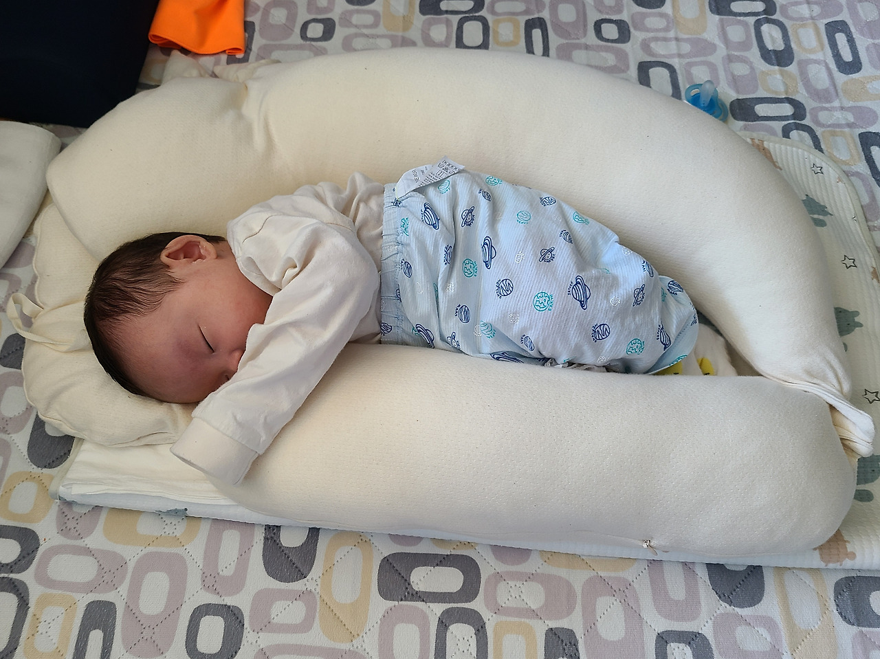 40일경부터는 모로반사 때문에 토끼잠을 자는데 한 시간을 재우기 위해 애쓴다면 15분 정도 자는 것 같다. 모로반사 하는 아기들에게 효과가 있다는 스와들업, 머미쿨쿨에 이어 라라스 옆으로 재우기 베개를 샀다.