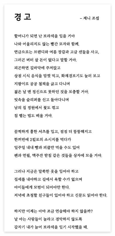 그러다가 제니 조셉이 쓴 '경고'라는 시를 읽으면서 무릎을 탁 쳤다.