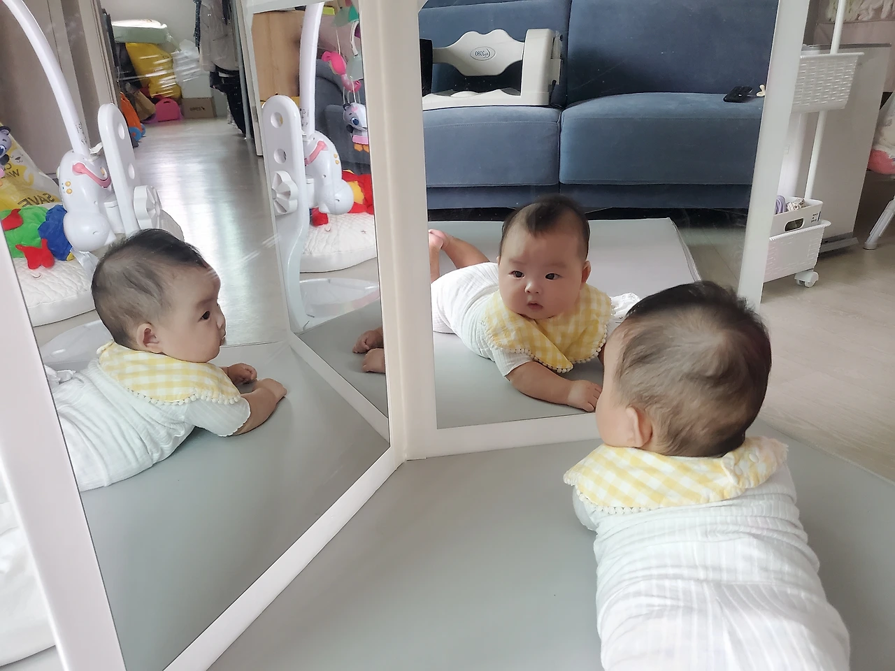 손으로 물건을 잡고 입으로 가져가는 건 진즉부터 시작했지만 손가락을 점점 더 정교하게 움직인다. 소근육 발달을 위해 계속 새로운 물건을 보여준다. 아직은 어려서 가지고 놀 수 있는 장난감이 별로 없다. 오볼, 애벌레 인형, 꼬리 책, 튤립 사운드북 등 오감을 자극하는 장난감 위주다. 최근에 놀이용 거울을 만들어 주었다. 이렇게 자기 자신을 보면서 한참 동안 시간을 보낸다.