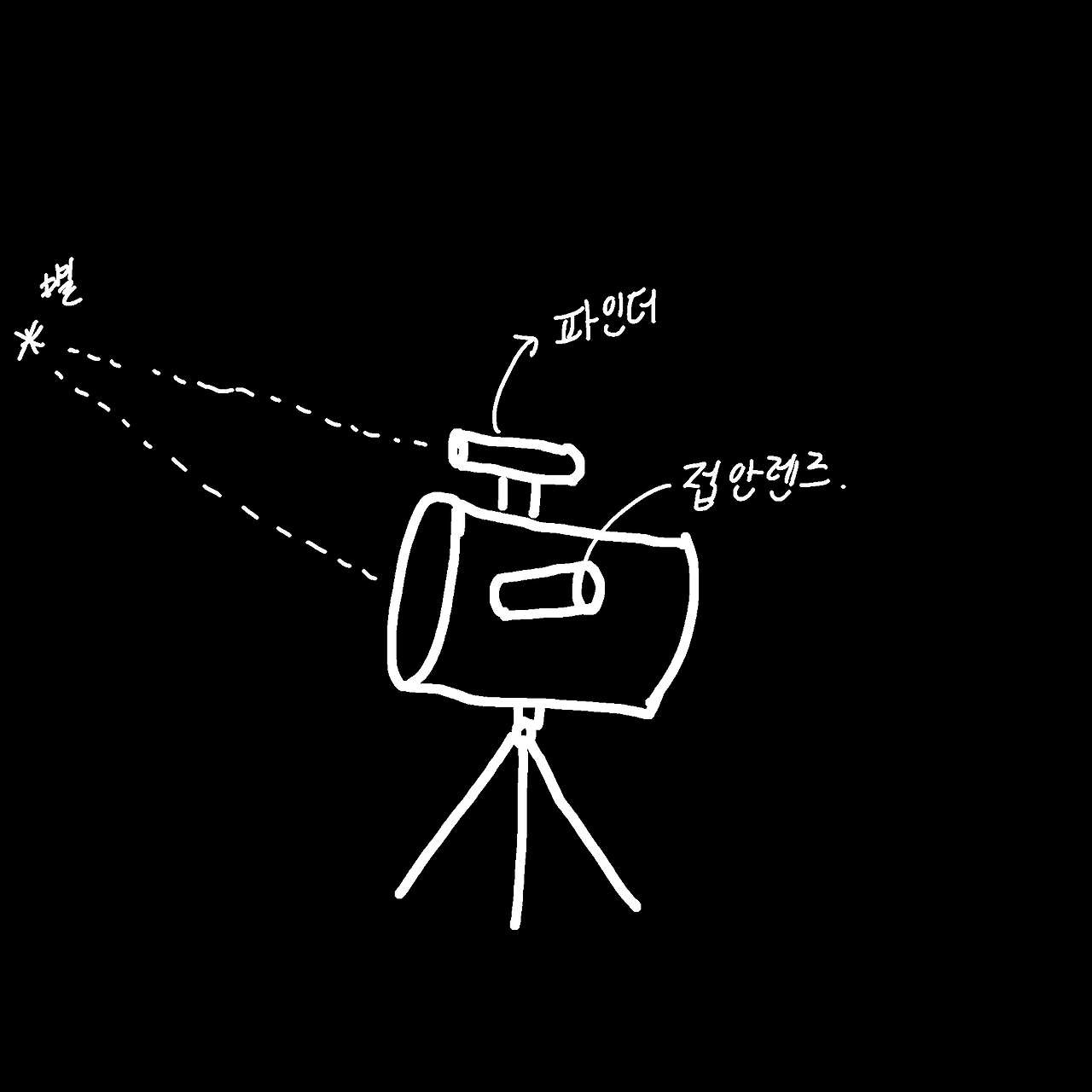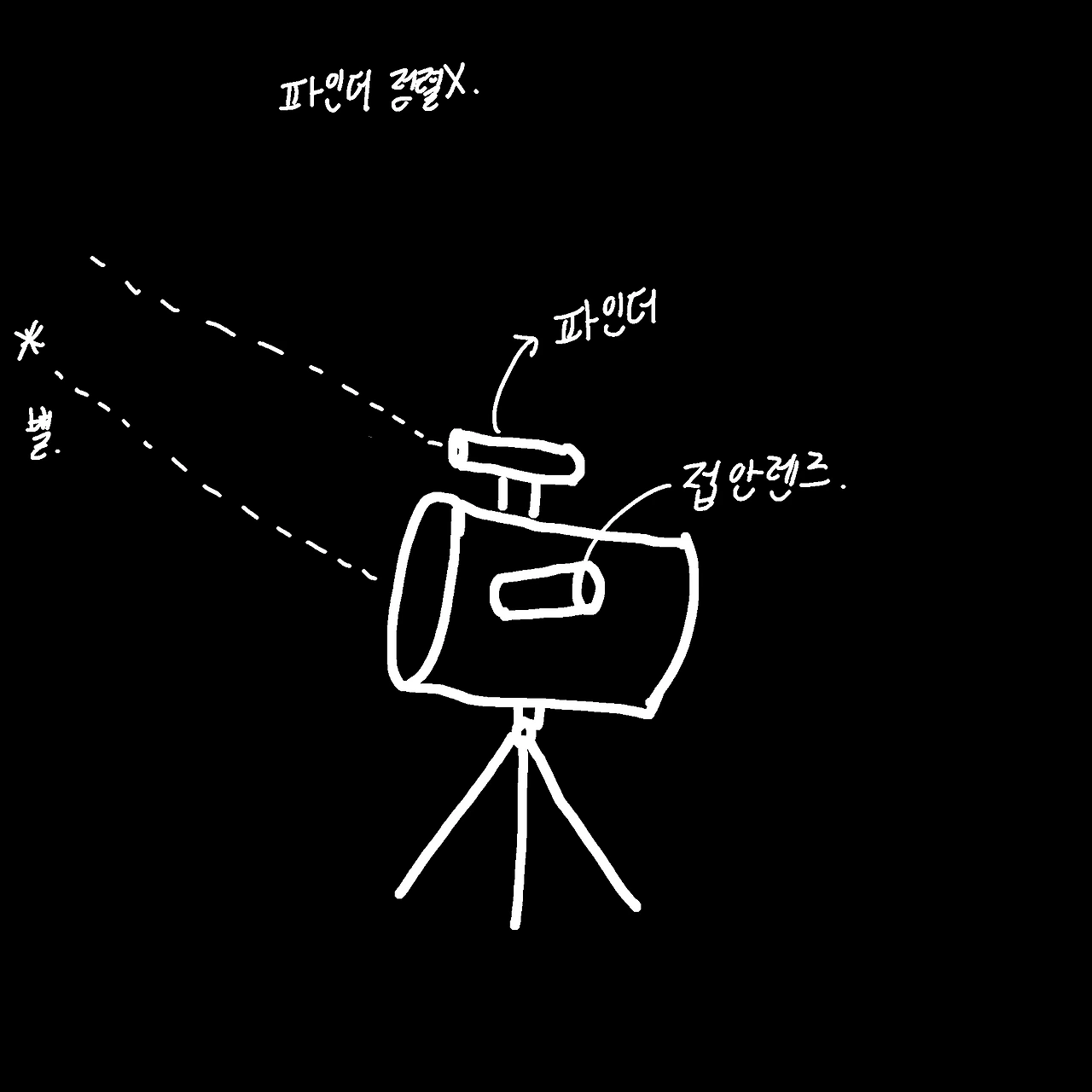 파인더는 망원경 위에 달려 있기 때문에 파인더로 보는 것과 망원경의 경통으로 보는 것이 다르다.