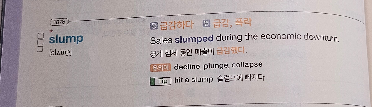 영어 단어 공부를 하다 slump 단어의 뜻을 알게 되었다. 일상적으로 힘들거나 지칠 때 자주 쓰이는 말인데 제대로 된 뜻은 처음 본다. 동사로 급감하다. 명사로 급락, 폭락이란 의미이다. 이 뜻을 보고 바로 든 생각은 급감했으니 올라갈 일만 남은 걸까란 것이다.