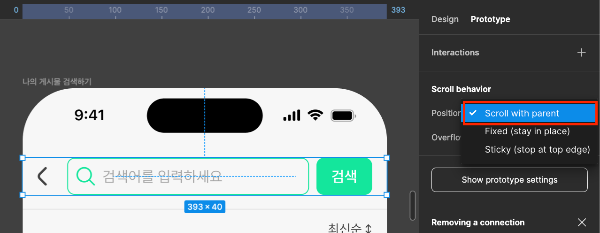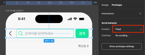 프로토타입 패널 내 스크롤 포지션 설정값을 고정으로 설정해 놓으면
