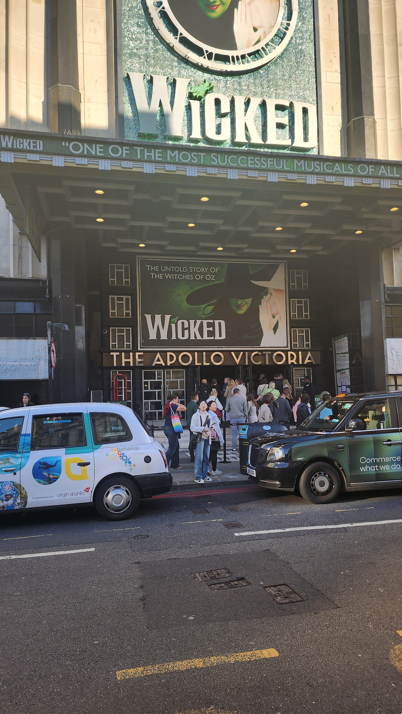 예약 없이 간 거라 바테이블 비슷한 자리에 배정받긴 했지만 그래도 대기 없이 와인 잔술 한잔에 손수건 파스타 맛본 걸로 만족! 다시 걸어서 그린파크를 통과하고 버킹엄궁전을 지나서 위키드 공연장인 빅토리아 극장에 예매 시간에 맞게 도착을 했다.