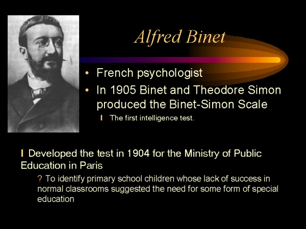 IQ는 1905년에 프랑스 심리학자인 알프레드 비네가 학생이 성장하고 학습하면 테스트 결과를 향상시킬 수 있을 것이라는 신념을 가지고 특수교육에 필요한 학생을 예측할 수 있는 시험을 만들기 위해 고안되었다고 한다. 비네가 처음에 이 테스트를 만들었을 때는 정상과 비정상을 구분지어 비정상에 속하는 이들을 사회에서 배제시키려고 했던 악한 의도로 접근한 것으로 보이지는 않는다. 오히려 학생들의 개별적인 특성을 고려해 교육의 불평등에 대한 비가시적인 간극을 줄이고자 한 것으로 보인다.