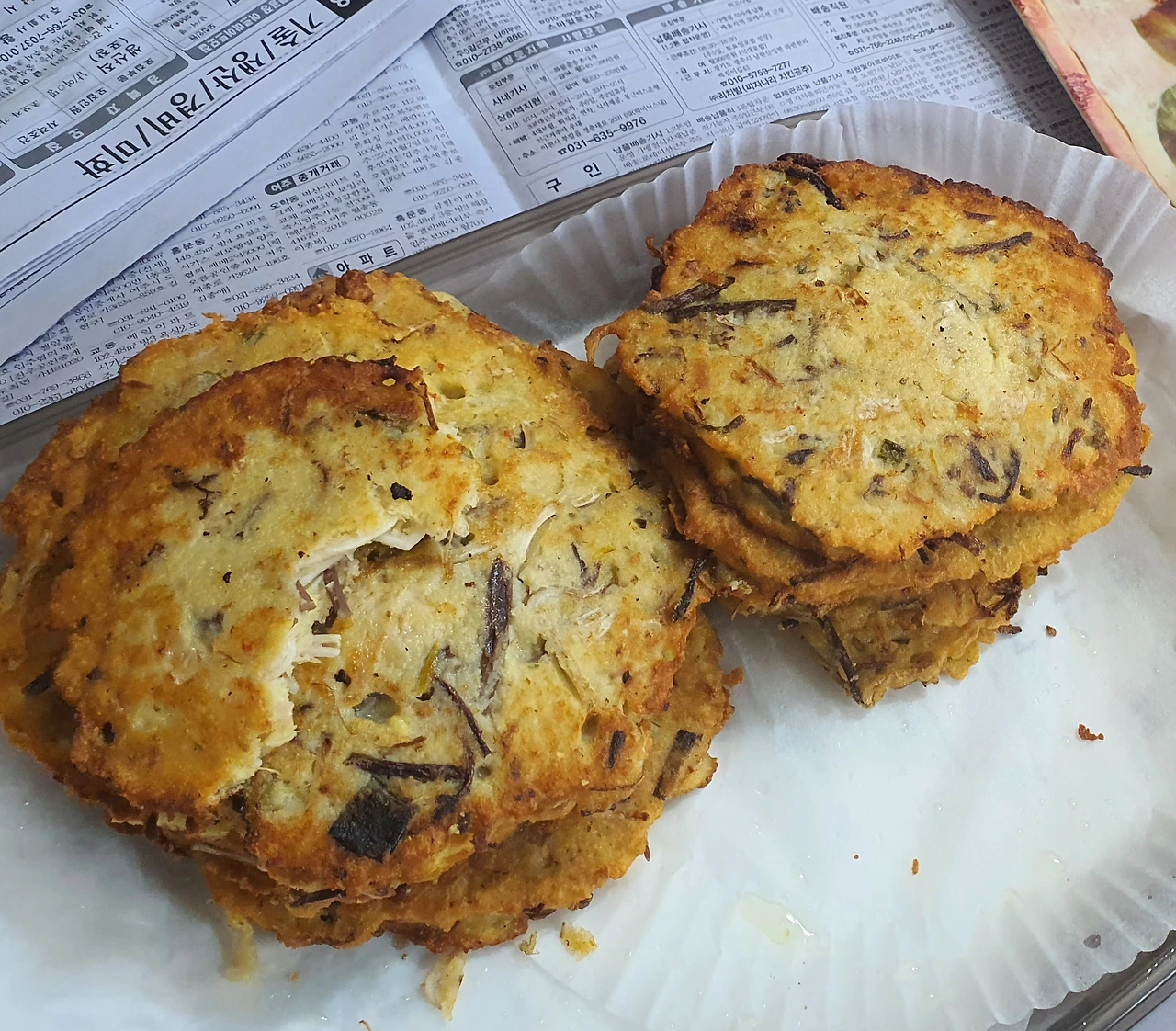 양파, 당근, 버섯을 넣어 씹는 재미를 주는 야채 전, 담백하고 고소한 살을 이로 부드럽게 씹어 넘기는 동태전 그리고 육즙이 가득한 동그랑땡으로 커다란 전 소쿠리를 하나 가득 채우는 걸로 끝나진 않습니다. 이윽고 널찍한 녹두전과 새콤한 김치전, 그날그날 슈퍼에서 신선한 재료를 사와 만든 자투리 전으로 집안의 모든 쟁반과 접시에 가득 채워야 하니 말입니다. 그렇게 식탁과 김치냉장고 위를 모든 전들이 점령하고 나서야 한껏 달아오른 프라이팬도 연신 불꽃을 뿜어내던 가스레인지도 얼굴에 흐르는 것이 땀인지 기름인지 모를 저와 엄마도 한숨 돌릴 수 있게됩니다.
