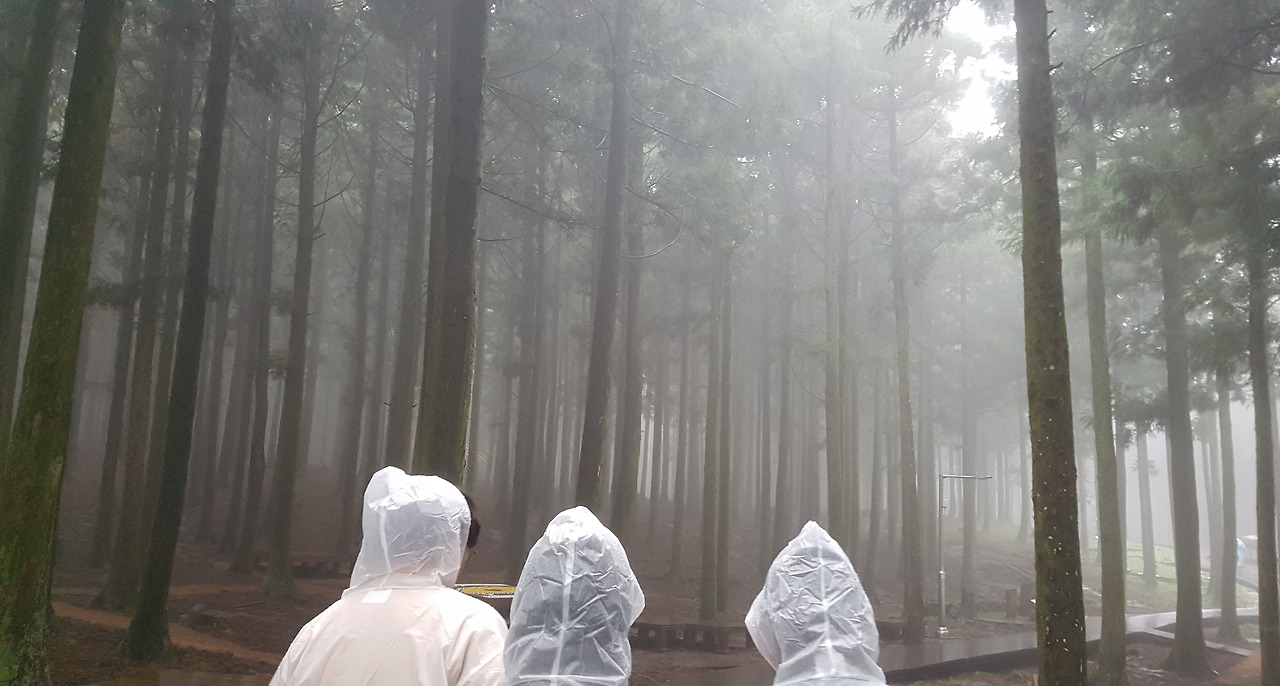 얼마나 갔을까. 와이퍼 움직이는 소리와 강렬한 비트가 흘러나오는 자동차를 이끌고 우린 비자림에 도착했다. 뿌연 안개가 만연한 주차장에 도착하고 나서도 나는 불만이 이만저만 아니었다. 아니, 도대체 이런 곳에서 뭘 할 수 있겠냐며. 그때 친구가 날 아이 달래듯 밀어붙이더니 우비를 4장 사 왔다. 우비는 어차피 비 맞으라고 입는 옷이라며 걱정 말고 가자는 친구의 성화에 못 이겨 비자림으로 들어가게 되었다.