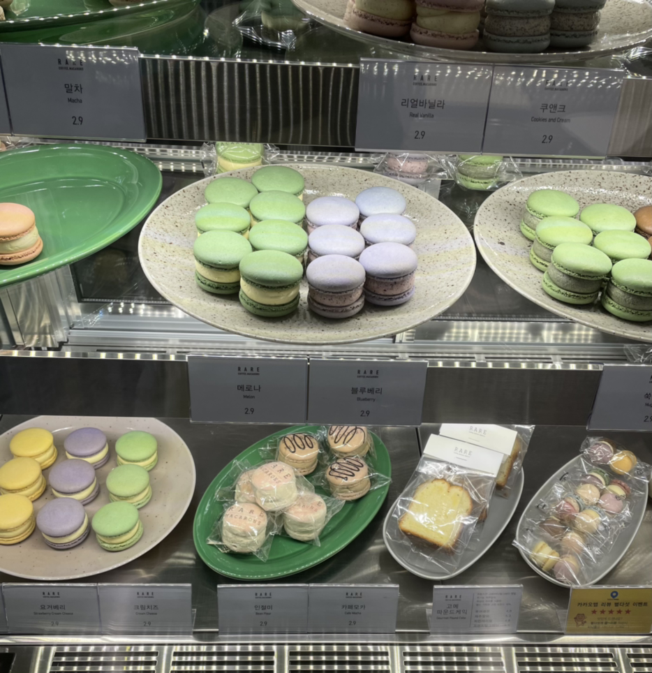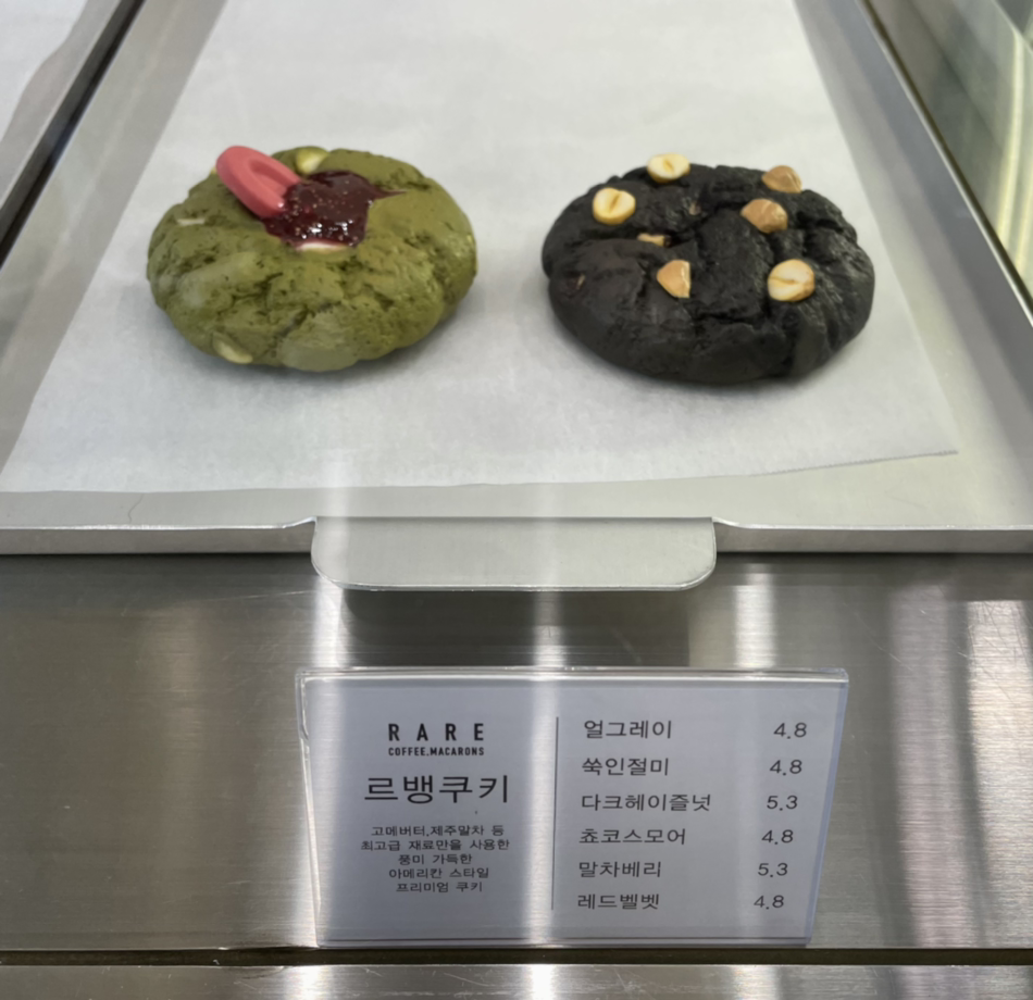 이곳은 잠실에서 유명하다고 하는 레어 마카롱이 만든 커피집이라고 한다. 그래서 쿠키와 스콘 외에도 마카롱 종류가 많다. 내가 갔을 땐 쿠키 종류가 벌써 많이 빠져서 다크 헤이즐넛과 말차 베리를 사고 옆에 마카롱 얼그레이와 말차 초코 2개를 샀다. 이곳의 르뱅 쿠키도 맛있지만 쿠키 식감이 아닌 달고 부드러운 스콘 식감에 더 가까웠다. 촉촉한 스콘을 먹는 기분이라 1개만 먹어도 배가 불렀다. 마카롱도 일반 마카롱이 아닌 뚱카롱으로 쫀득한 꼬끄에 풍부한 크림까지 있어 내 스타일의 마카롱이다. 쿠키가 스콘 식감이라면 파운드 케이크도 맛있을 것 같다. 나중에 사봐야지..