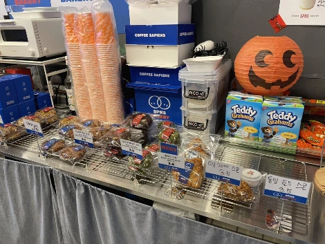 커피 테이크아웃이 많은 가게라 그런지 매장은 아주 협소했다. 카페 주인이 젊은 남성분이라 그런지 힙한 노래에 또 사진 찍었던 당시가 핼러윈데이 시즌이라 곳곳에 인테리어를 핼러윈 장식으로 꾸미셨다. 여긴 쿠키 종류가 많은데 그중 또 동일하게 뉴욕 초코쿠키와 말차 마카다미아 쿠키를 샀다. 동네에서 먹어본 르뱅 쿠키 중에서 이곳의 쿠키가 제일 적당하고 정석의 르뱅 쿠키 느낌이었다. 매일 아침 사장님이 직접 쿠키와 스콘을 구우신다던데 사장님 정말 잘하시네요... 다음에 피넛버터 초코쿠키 찜콩!