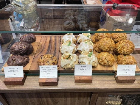 이곳은 커피와 밀크티가 유명한 가게로 밤늦은 시간까지 손님들이 꽤 있다. 차분한 매장 분위기에 디저트류도 판매하고 있다. 쿠키는 초코렛 르뱅 쿠키와 크랜베리 르뱅 쿠키 2종류뿐이다. 그래서 쿠키 덕후인 나는 2개를 다 샀다. 마치 빵처럼 두툼한 두께에 촉촉한 촉감이라 둘 다 맛있었지만 단 걸 좋아하는 나는 초코렛 르뱅 쿠키가 맛있었다. 담백한 걸 좋아하는 사람은 크랜베리 르뱅 쿠키가 입맛에 맞을 것 같다. 두 개만 먹어도 벌써 배가 불러 르뱅 쿠키는 식사대용?으로도 알맞다. 쿠키가 맛있으면 당연히 옆에 스콘도 맛있을 거다. 나중에 레몬 딜 스콘을 사봐야겠다.