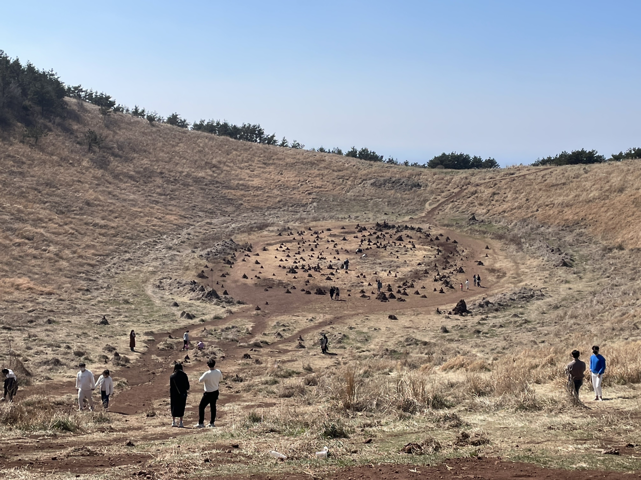 저질체력인 내가 쉽게 오를 수 있는 오름이 무엇이 있을까 검색하다가 이효리가 뮤직비디오를 찍은 곳이기도 하고 효리네 민박에서 이효리와 아이유가 올랐던 오름이라 유명해진 금오름을 갔다. 금오름은 올라가는 초입부터 잘 가꾸어진 느낌이고 나 같은 초보자도 다른 오름보다는 비교적 짧은 시간 안에 오를 수 있는 오름이다. (그러기에는 중간중간 많이 쉬면서 올라갔다) 올라가 보면 한라산 백록담 미니어처 같은 분화구가 있어 나름 특색 있는 오름이라 생각하고 아래를 내려다볼 수 있는 풍경을 보면 마음이 뻥 뚫린 것 같이 시원하다.