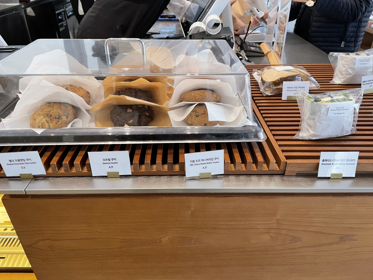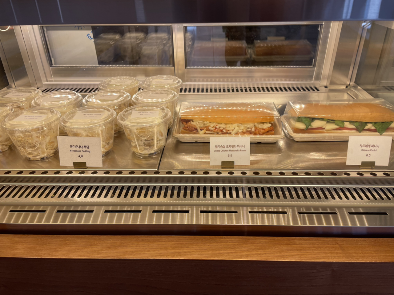 메뉴로는 커피와 몸에 좋은 과일주스가 있고 베이글, 샌드위치, 베이커리 등을 판매하고 있다. 이곳의 커피는 원두를 고를 수도 있고 정말 맛있고 고소하다는 얘기가 있지만 초등학생 입맛인 나는 우선 쿠키를 집었다. 내가 좋아하는 르뱅 쿠키 스타일로 월넛 초콜릿 쿠키, 오트밀 쿠키, 더블 초코 허니버터 칩 쿠키 이렇게 3가지가 있다. 종류별로 다 먹어봤는데 하나같이 겉은 바삭하며 속은 촉촉한 게 맛있었다. 내가 좋아하는 뉴욕 바나나 푸딩도 있는데 이곳의 시그니처 메뉴라고 한다. 나중에 다시 올 때 먹어봐야겠다.