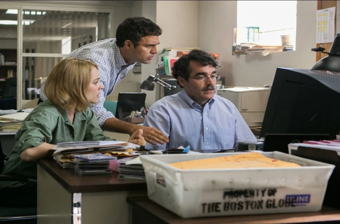 심각하게 곪아있는 사회적 문제를 다루면서 자칫 자극적이게 보일 수 있는 플래시백 장면이 단 하나도 없는 점이, 이 영화가 단순히 화제성에 힘입어 성공하려는 시도가 아님을 보여준다. 또 가해자가 수없이 많다는 것을 처음 알게 된 전화를 받을 때, 그리고 마이크가 법원에서 받아온 문서를 읽으며 추기경이 사건을 덮었다는 것이 드러날 때, 카메라가 말을 하는 사람으로부터 점차 줌아웃되며 팀 전체를 비추고 팀이 위치한 사무실 전체를 비추는 연출이 매우 인상적이다. 새로운 정보가 주는 충격과 파급력을 이렇게도 표현할 수 있다.