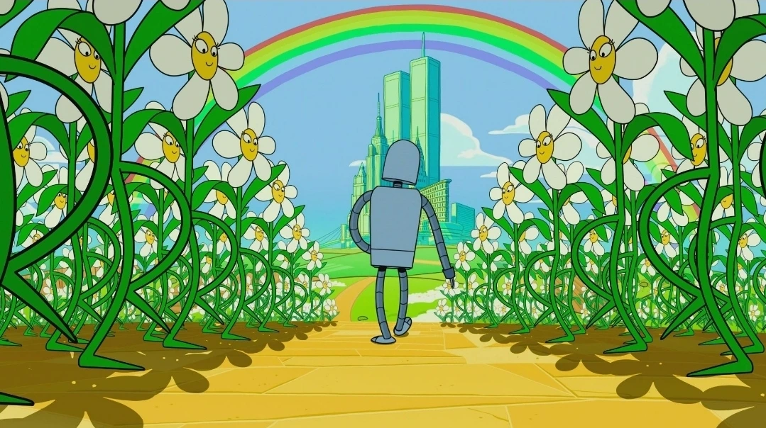 로봇의 꿈과 환상이 섬뜩하고 기발하다. 꿈에서는 끊임없이 개의 집으로, 몇 번이고 경쾌하게 휘파람을 불며 찾아간다. 그런 시퀀스마다 또 어떤 고통스러운 모습으로 꿈에서 깰지 조마조마하고 마음이 무겁게 된다. 토끼들이 불시착하자 로봇은 그 토끼들이 자신에게 기름을 넣어주는 환각에 빠졌는데, 로봇이 개의 집을 찾아가 노크하는 소리는 이내 토끼들이 로봇의 다리를 잘라내는 소리로 이어진다. 겨울 내내 눈에 파묻혀 얼어버린 로봇은 심지어 스크린의 경계 바깥으로 빠져나와 스크린 자체를 돌려 뒤집어버리고는 스크린의 뒷면으로 들어간다. 여태 관객들이 보아온 스크린의 앞면은 정말 고통스럽기에, 뒷면으로 가 개를 만나고 싶기에. 그렇게나 큰 환상에 사로잡혀서, 그렇게나 강한 염원을 꿈꾼다. 뒤집힌 스크린에서 로봇은 개와 함께 즐겼던 영화 오즈의 마법사의 세상 속으로 들어간다. 컬러영화의 지평을 연 오즈의 마법사라는 점에서도, 캐릭터가 로봇이라는 점에서도 기발하다.