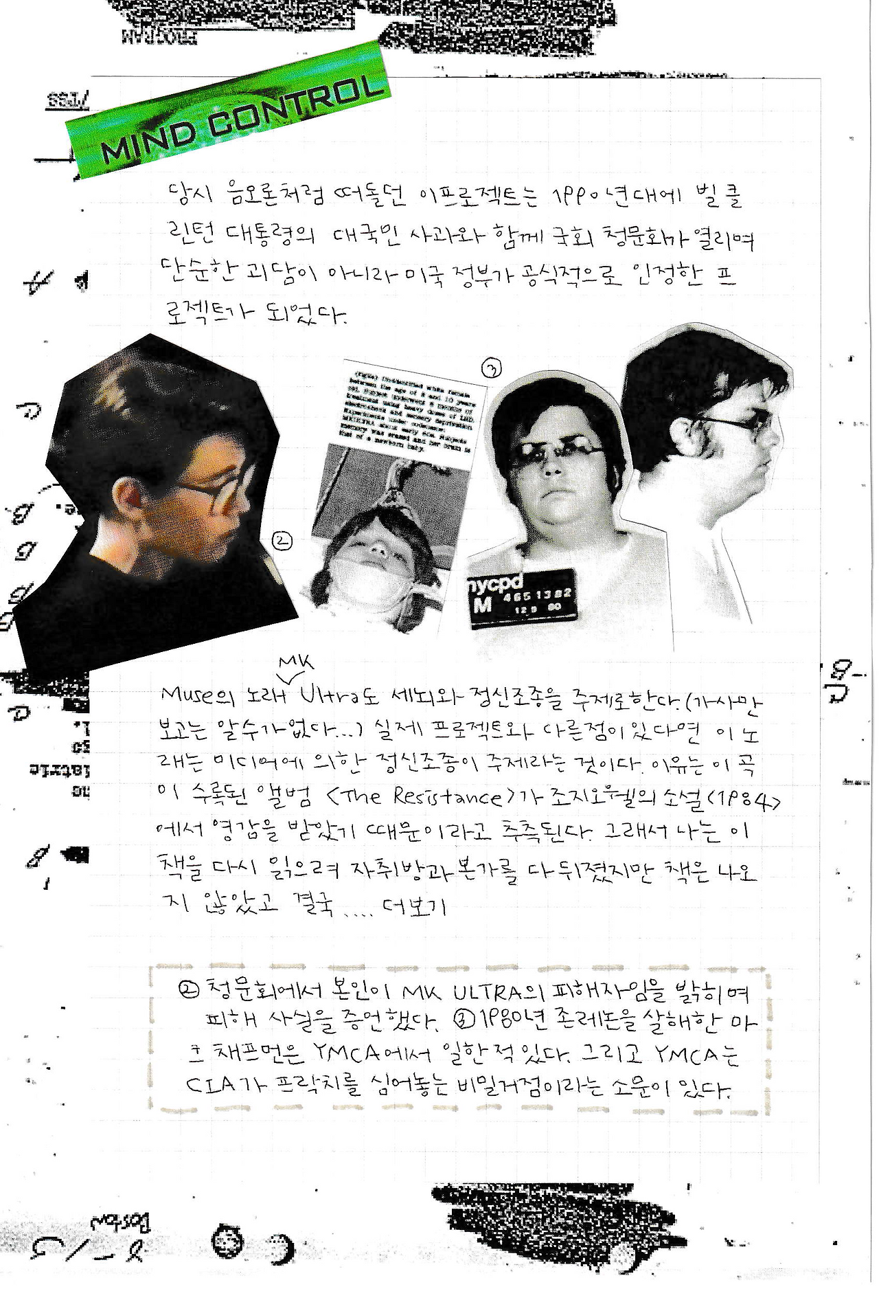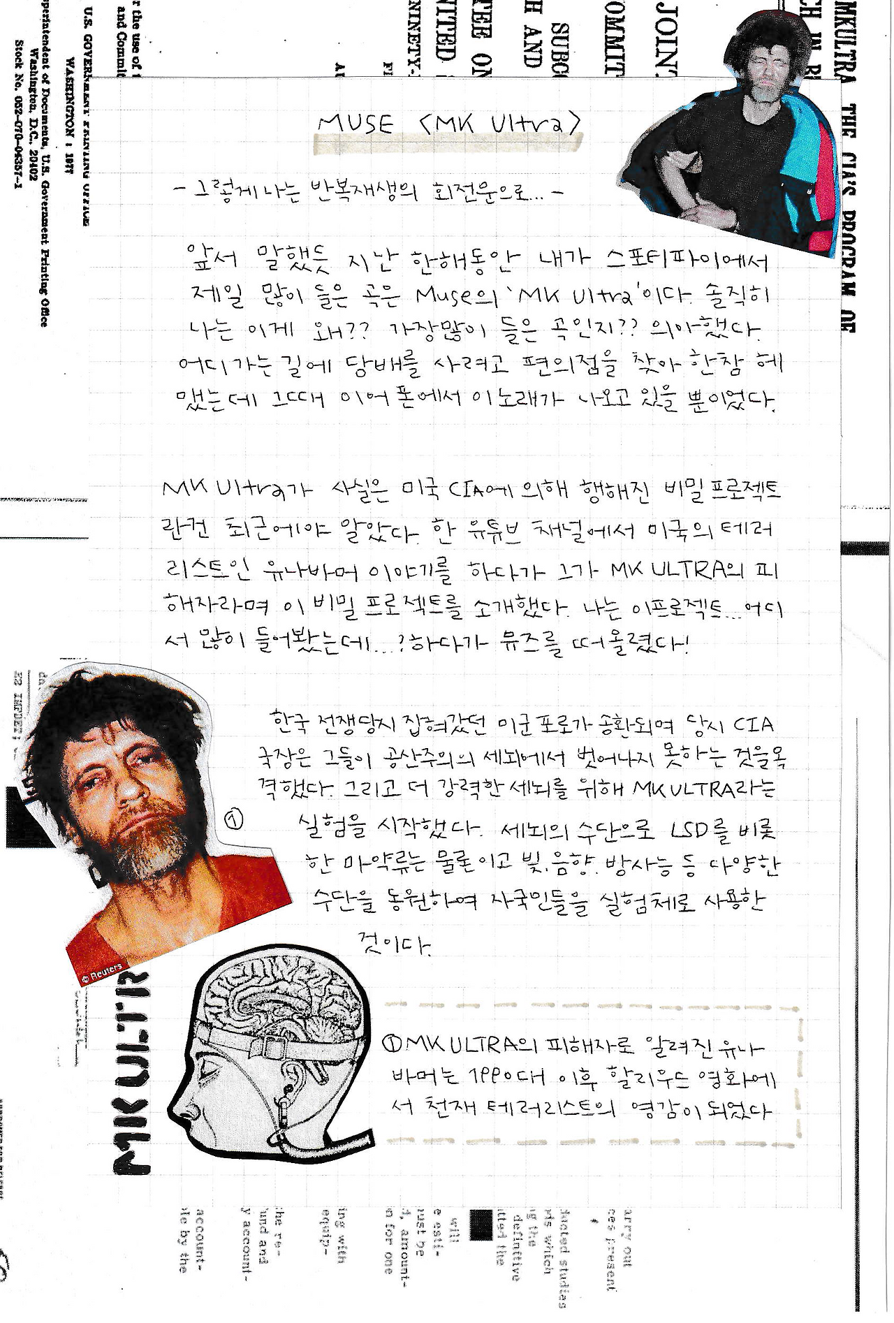 ‘MK ULTRA’가 사실은 미국 CIA에 의해 행해진 비밀 프로젝트라는 건 최근에 안 사실이다. 한 유튜브 채널에서 미국의 한 테러리스트인 유나바머 이야기를 하다가 그가 ‘MK ULTRA’의 피해자라며 이 비밀 프로젝트를 소개했다. 나는 ‘어디서 많이 들어봤는데…’ 하다가 뮤즈를 떠올렸다!